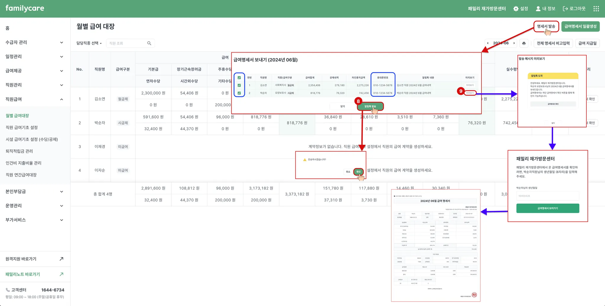 명세서 알림톡의 경우, 명세서를 받으실 직원의 전화번호가 입력되어 있어야 전송이 가능합니다. (*전화번호 입력은 직원관리 메뉴에서 가능합니다. 전화번호 입력이 안되어 있을 경우, 체크박스가 노출되지 않습니다!)