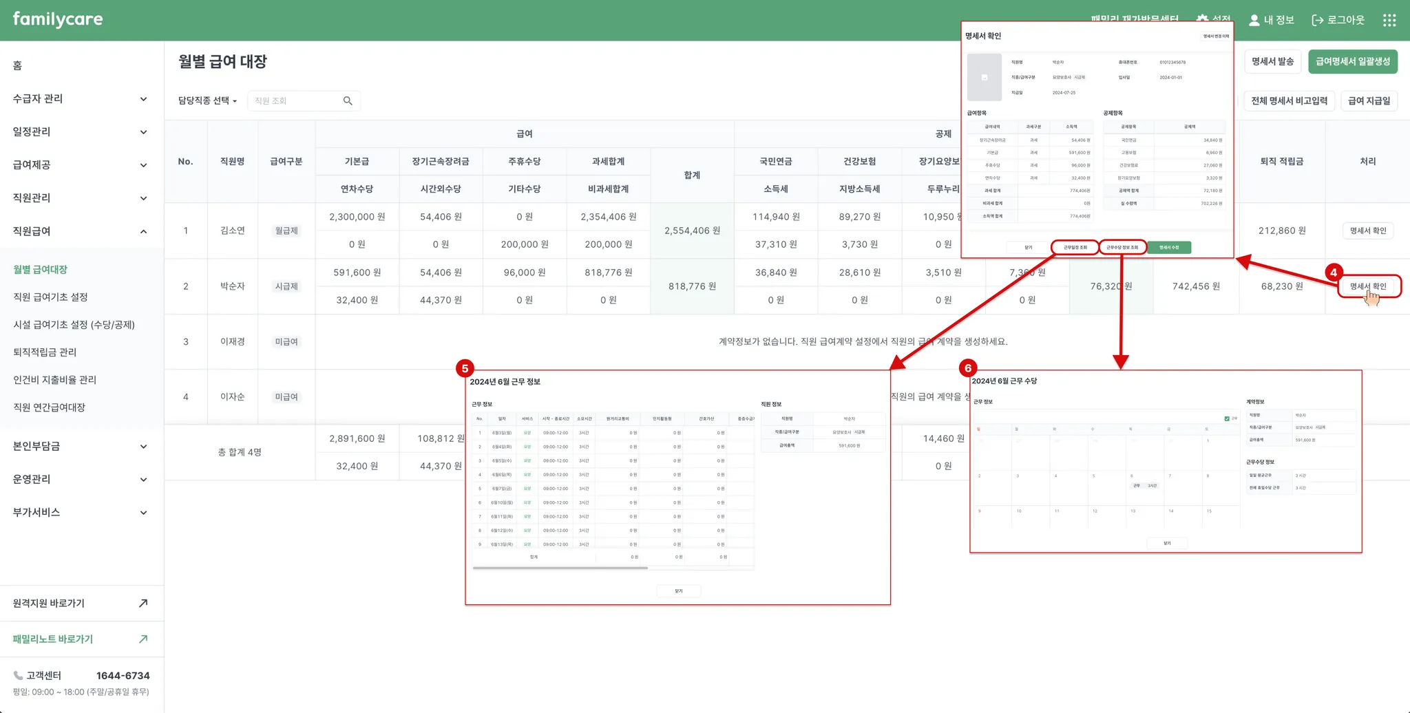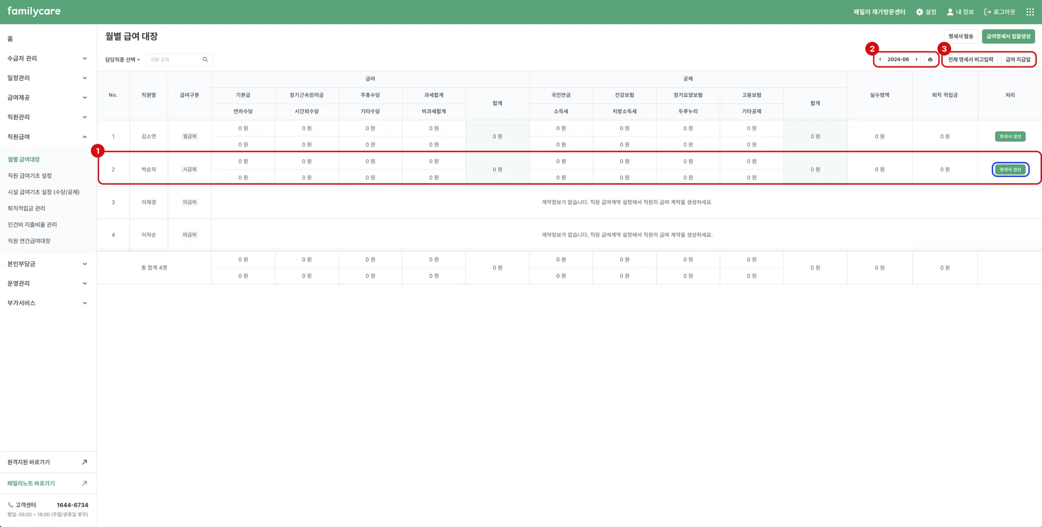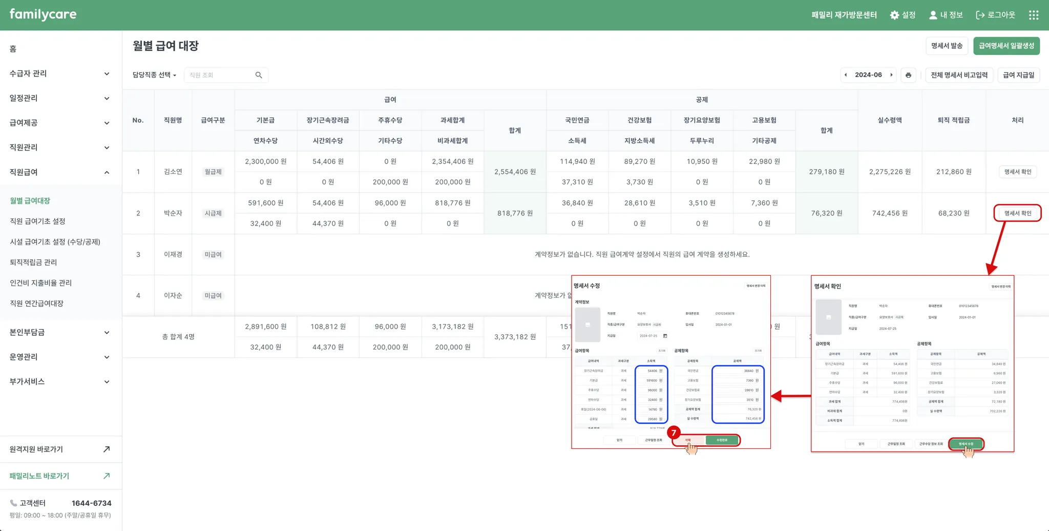 시설 급여기초 설정과 직원 급여기초를 설정하고 나면, 이제 급여명세서를 생성할 수 있습니다. 해당 직원의 급여 내용과 공제 내용을 확인하기 위해서 명세서 생성 버튼을 선택 해 주세요!