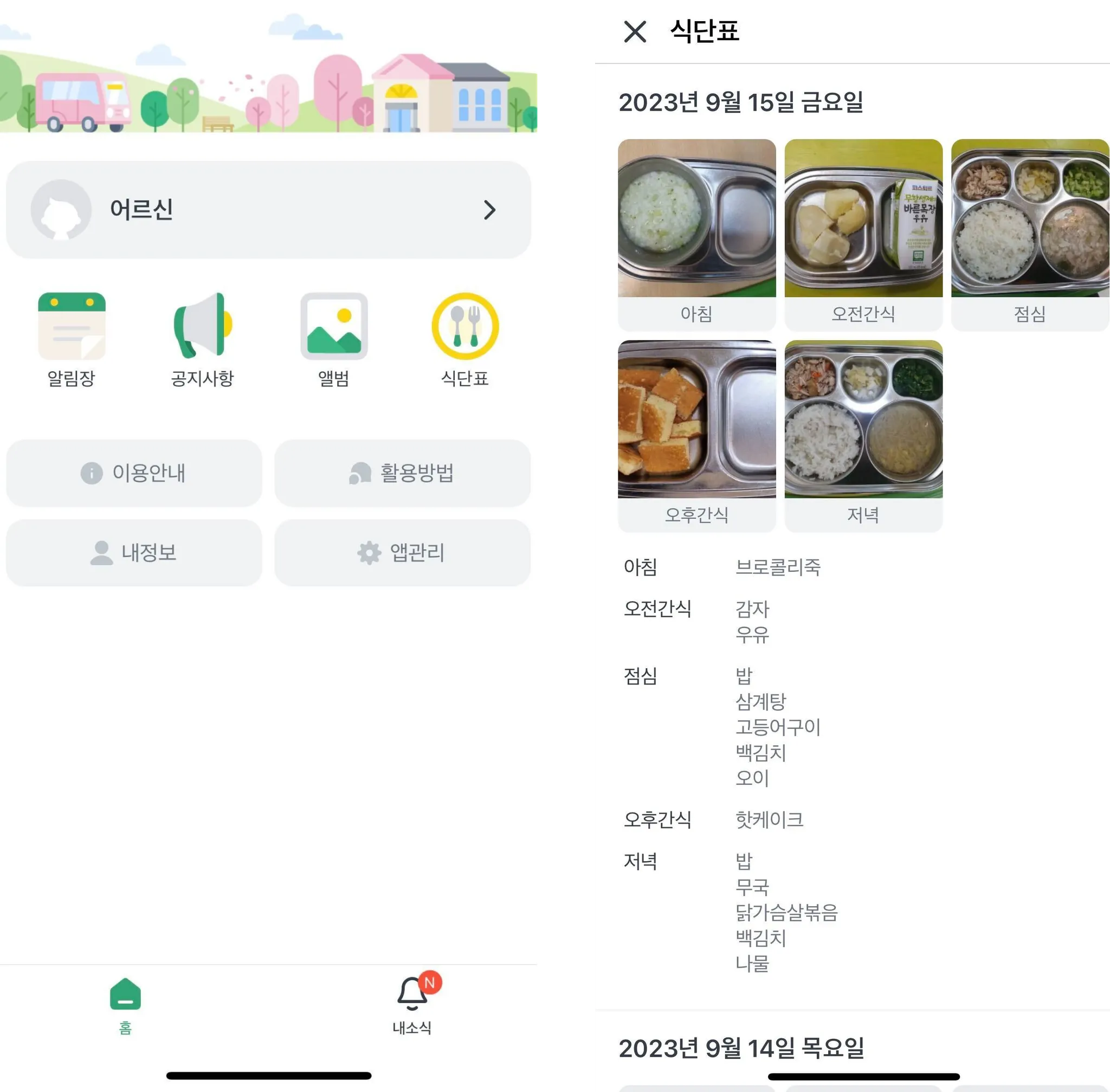시설에서 올려주시는 어르신의 식단과 메뉴를 확인할 수 있습니다.