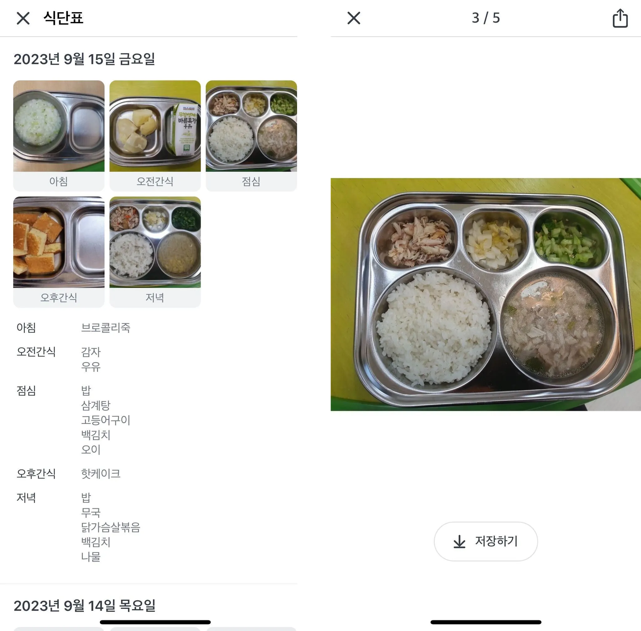 - 확대한 그림을 끄지않고 화면을 넘기면 식단 사진을 바로 볼 수 있습니다.