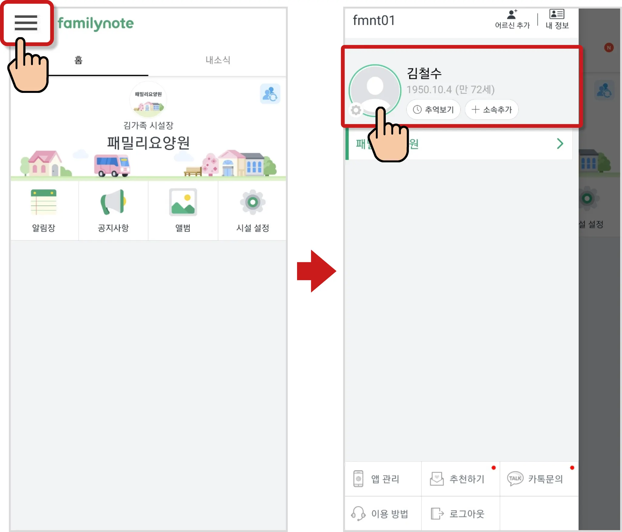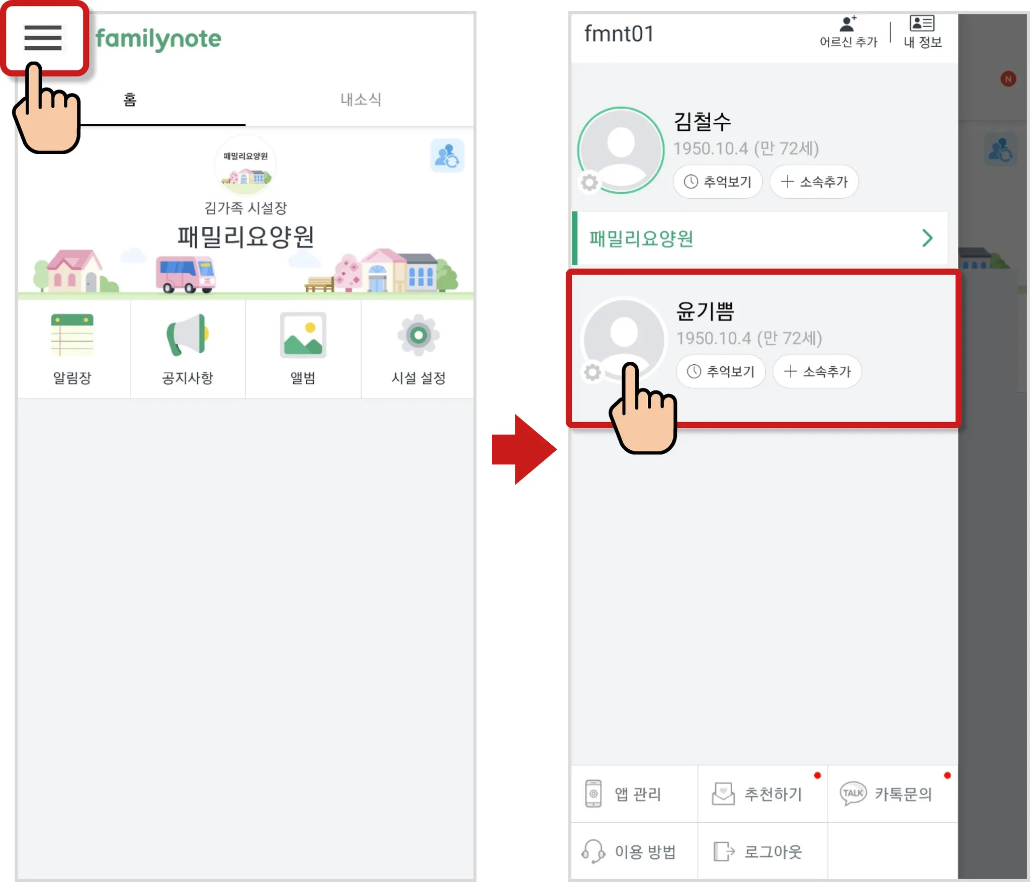 [≡] 선택 후 어르신의 동그라미 프로필을 선택합니다.