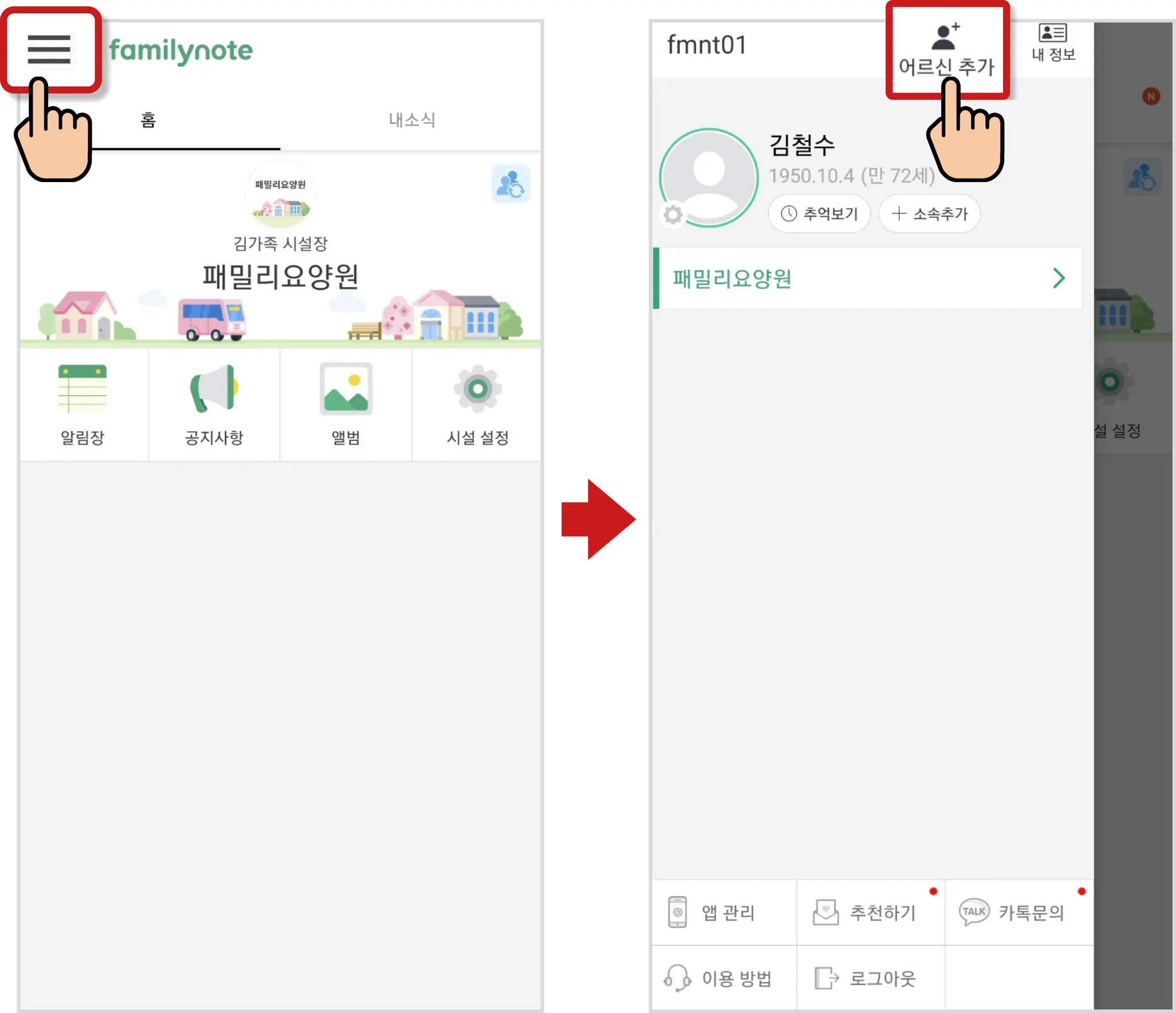 [≡] 선택 후 어르신 추가 버튼을 선택합니다.