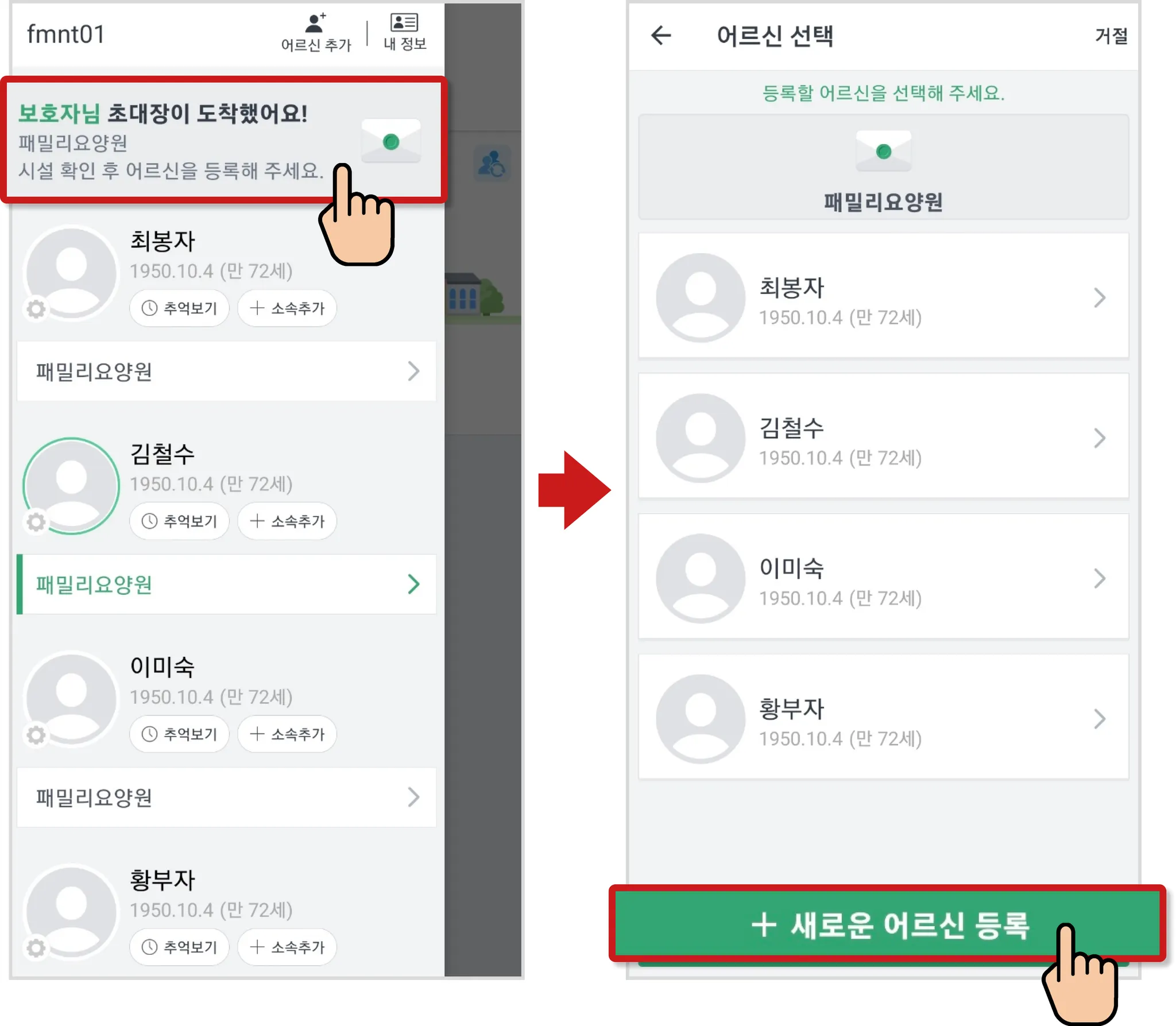 시설에서 초대장을 받았다면 초대장을 선택한 뒤 [새로운 어르신 등록] 버튼을 선택합니다.