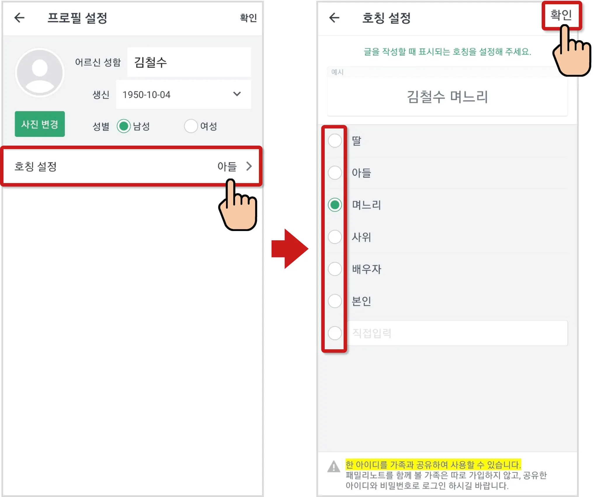 [호칭 설정]을 누르고, 글 작성 시 적용될 호칭 선택 후, [확인]버튼을 누르면 선택하신 호칭으로 이용이 가능합니다.