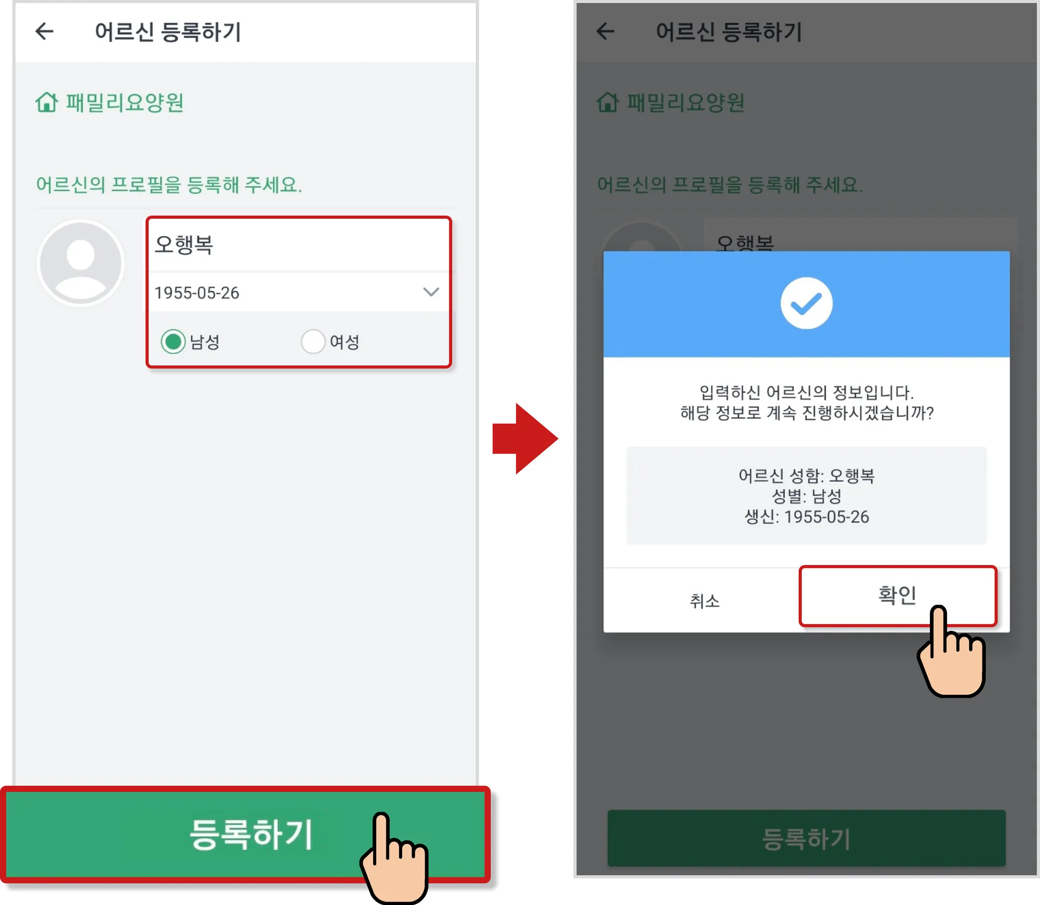 어르신 정보를 등록한 후, 시설에서 승인을 하면 등록이 완료됩니다.
