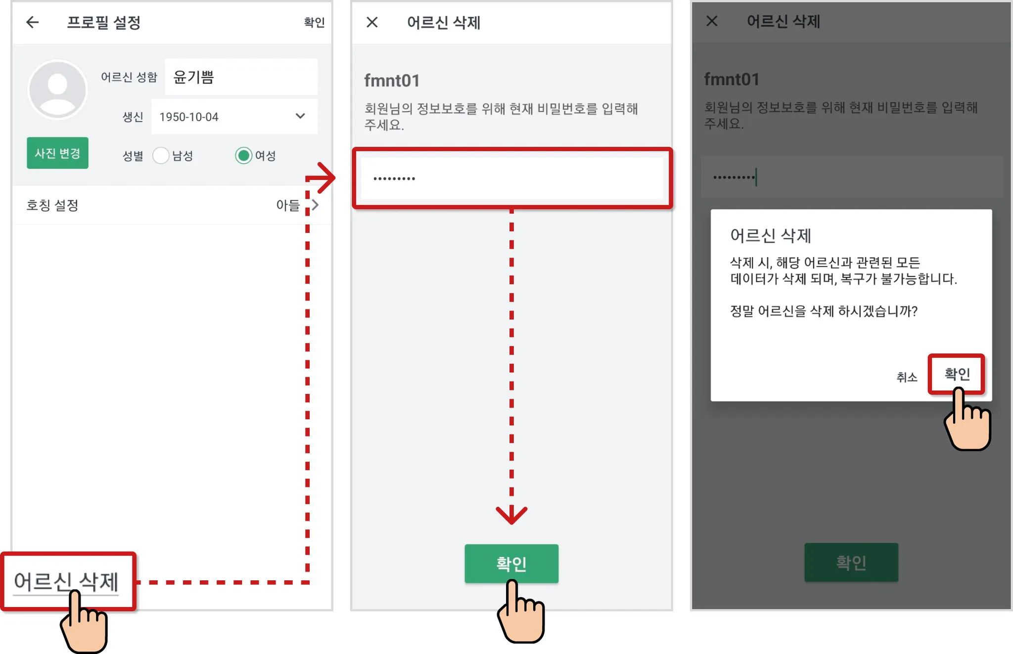 비밀번호 입력 후 [확인]버튼을 눌러 어르신 삭제 안내를 확인한 뒤, [확인]을 누르면, 삭제가 됩니다.