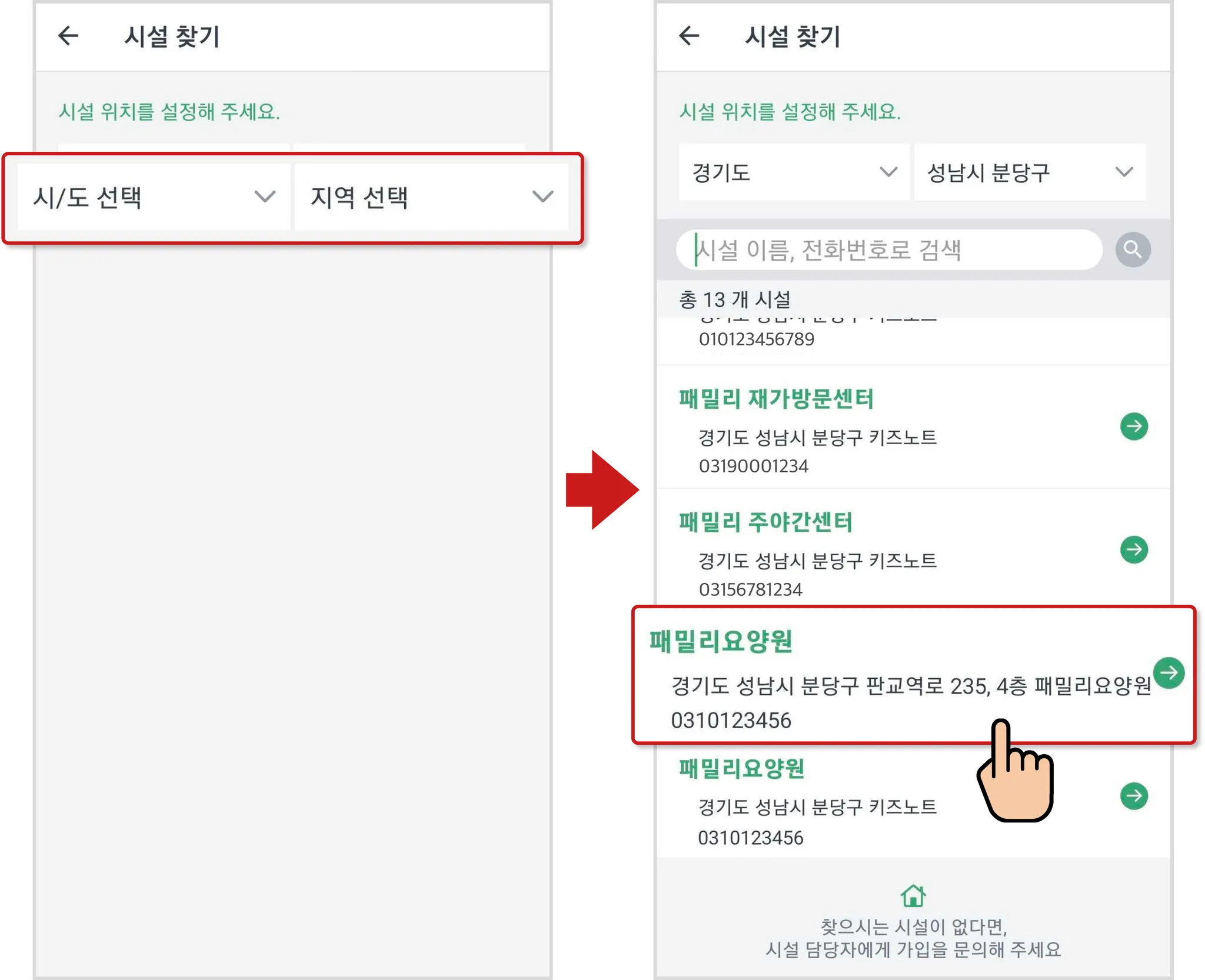 회원가입과 같은 방법으로 시설 찾기를 통해 소속될 시설명을 선택합니다.