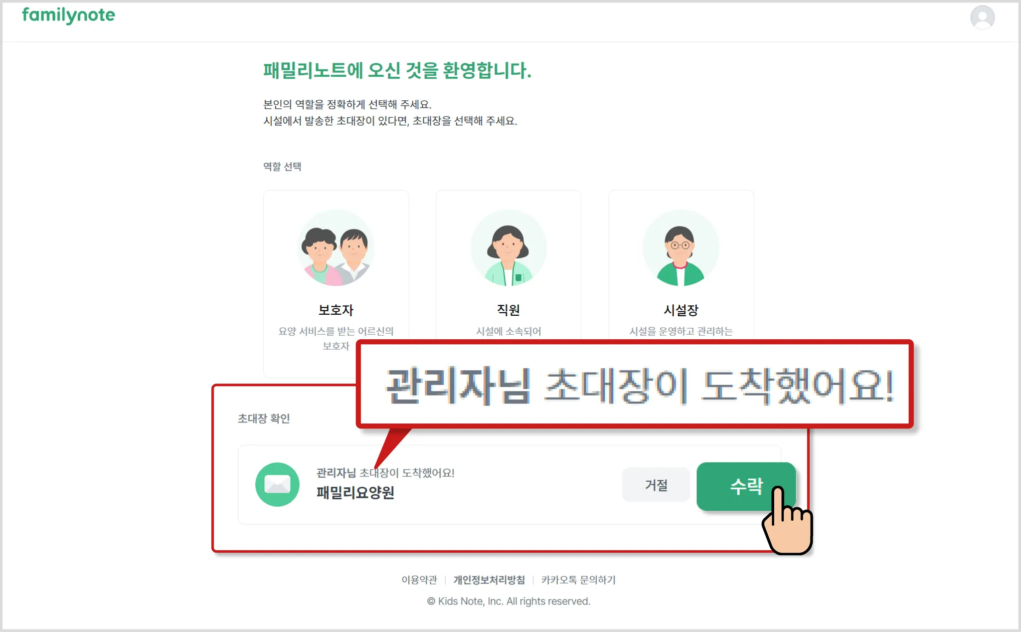 회원 가입이 완료되면, 역할 선택 페이지 하단에 [초대장]이 나타납니다.