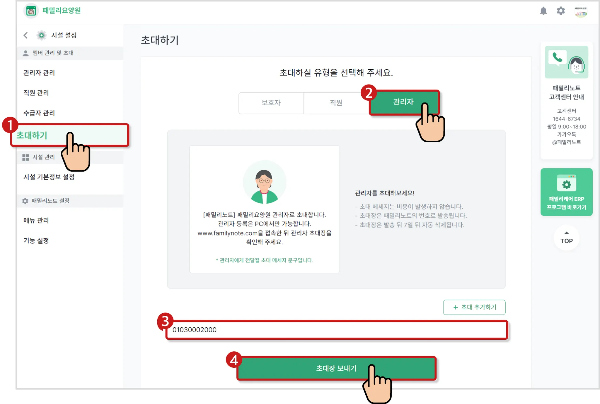 > [새로오시는 시설장님의 휴대전화번호입력] 후, [초대장 보내기]를 누르면 초대장이 발송됩니다.