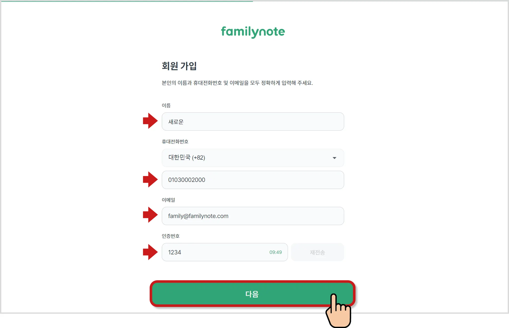3. 변경 후 대표 관리자님 성함 + 휴대폰 번호 + 패밀리노트 ID