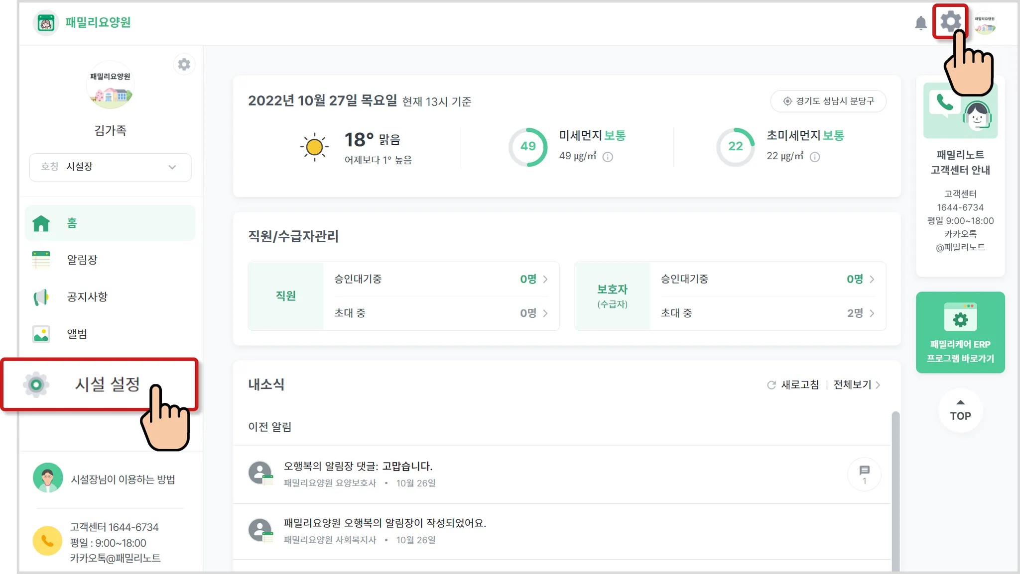 현재 시설의 대표관리자님의 ID로 로그인 후, [시설 설정]버튼을 선택합니다.