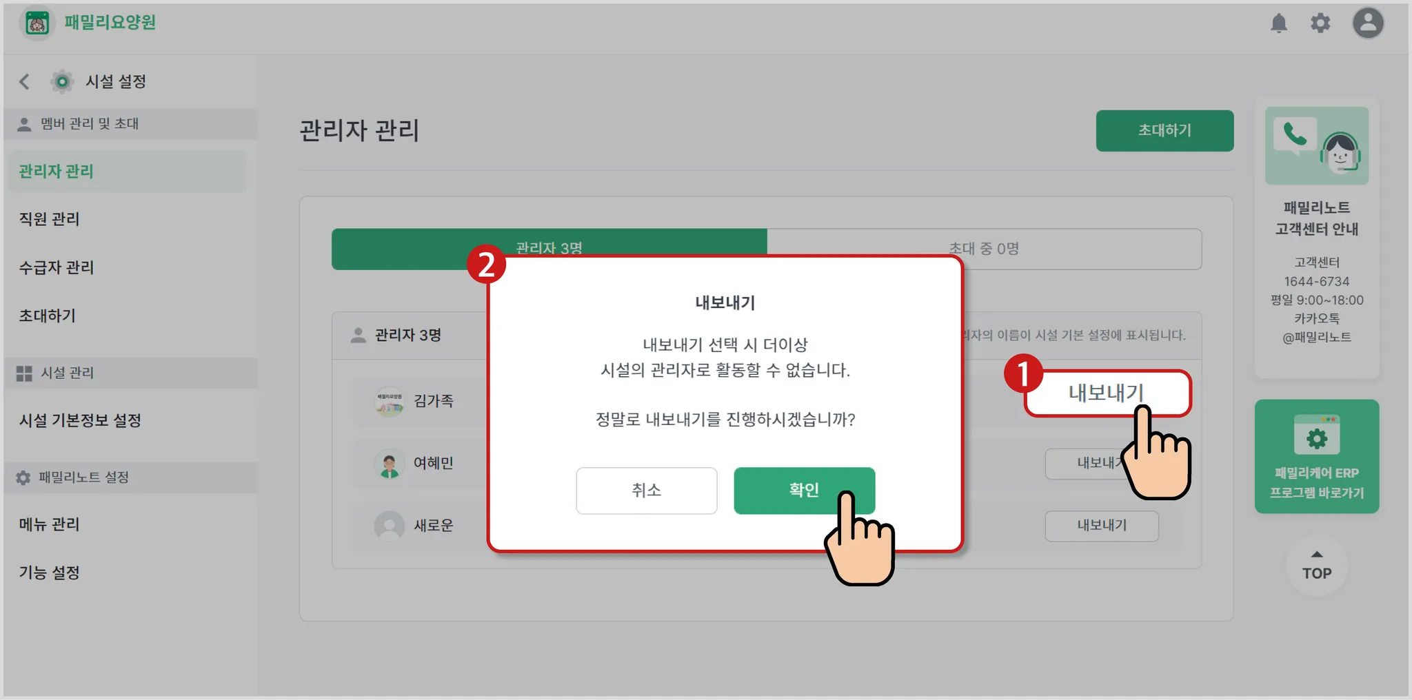 [일반 관리자]로 변경 된 기존 관리자를 내보내고자 하시면, [내보내기] > [확인] 버튼을 눌러주시면 됩니다.