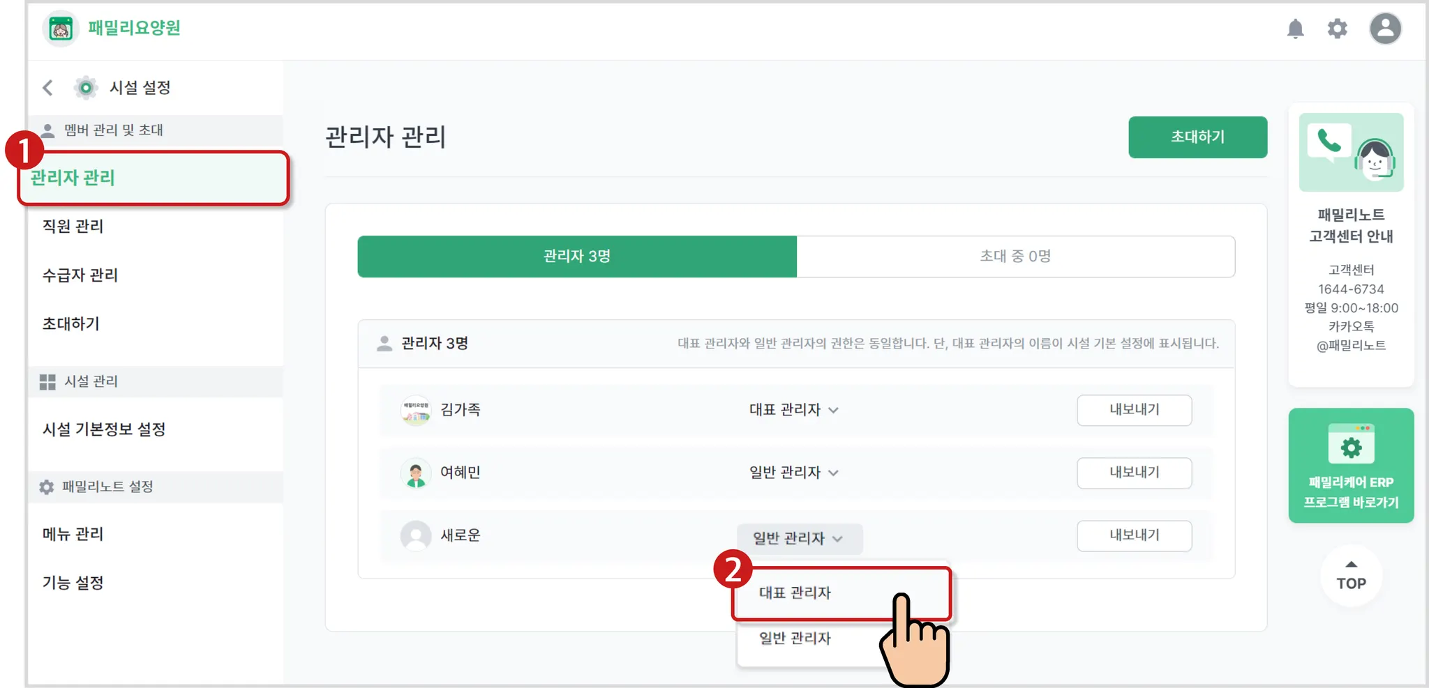 [관리자 관리]를 누른 후, 본인의 역할을 [대표 관리자]로 선택합니다.