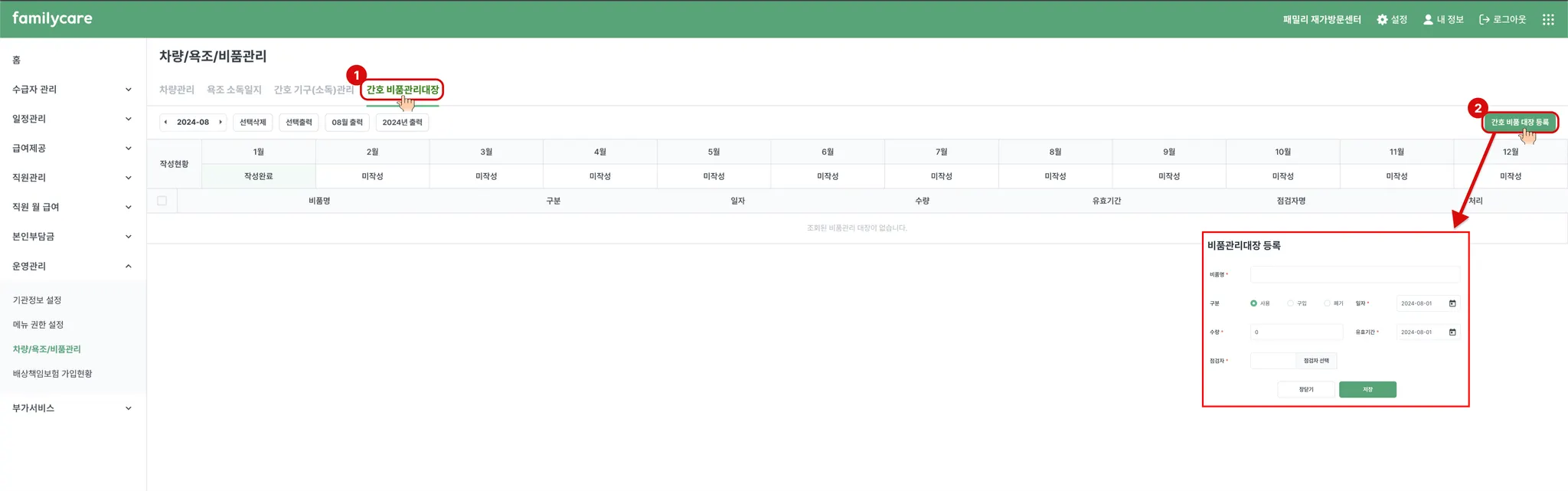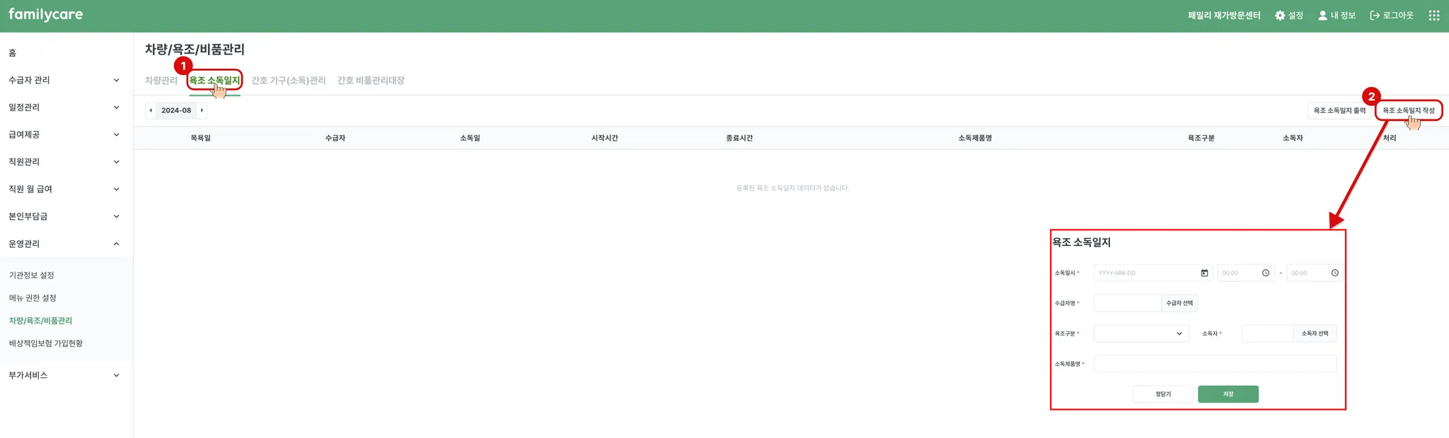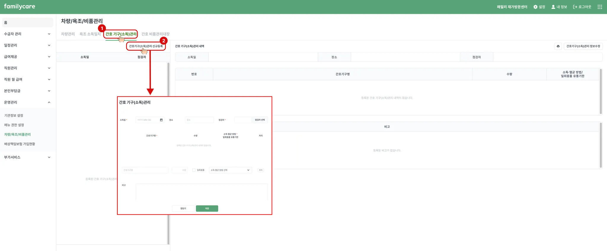 기관에서 운영하는 차량의 운행기록과 정비기록, 방문목욕을 사용하는 센터에서 정비하는 욕조 소독일지, 방문간호를 사용하는 센터에서 관리하는 간호 소독관리 및 비품관리 대장을 입력하여 저장하고 관리할 수 있습니다