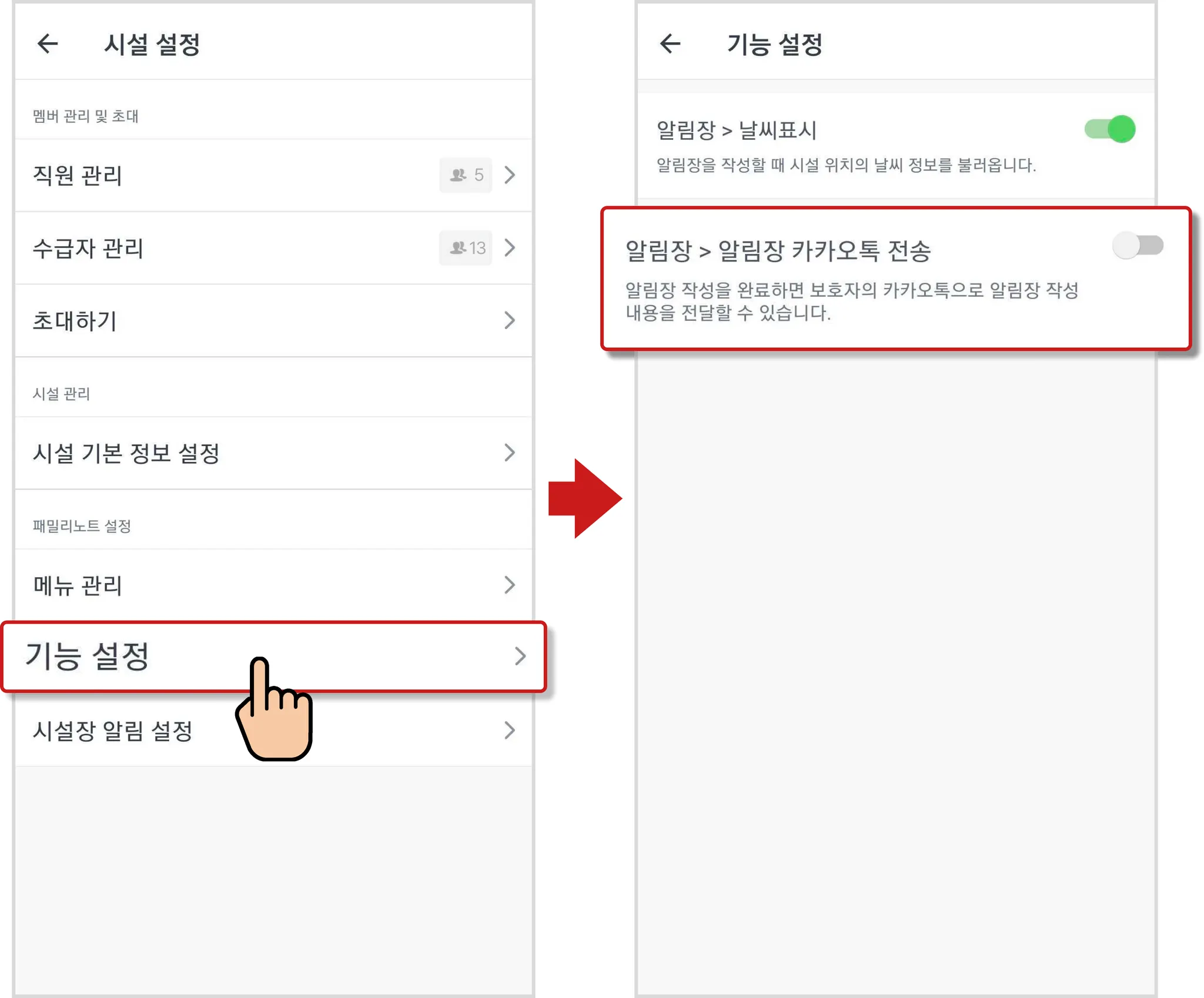 [기능 설정]을 누르면 기본으로 설정되어있는 [알림장>카카오톡 전송] 버튼을 끕니다.