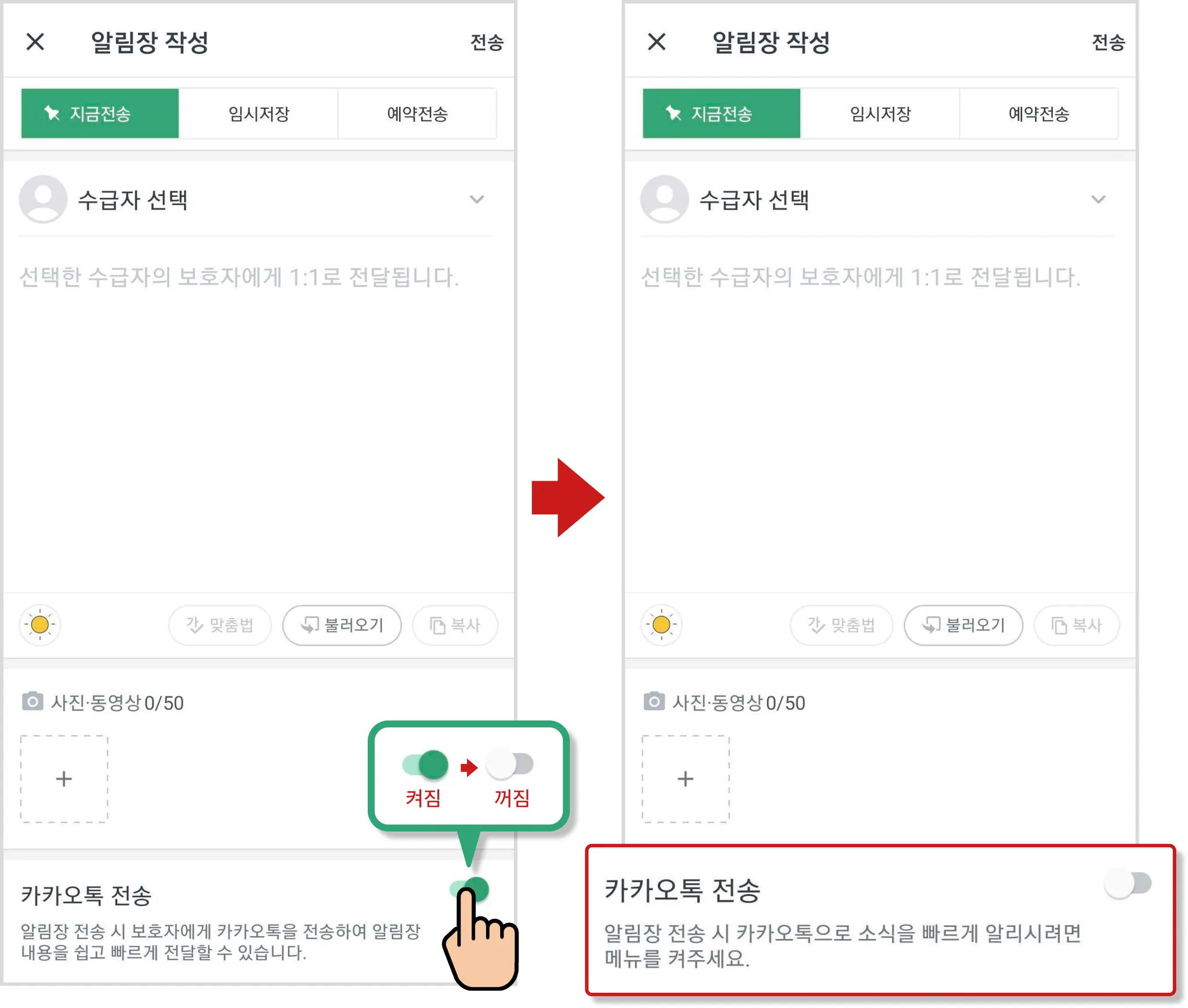알림장 작성 시, 하단의 [카카오톡 전송] 버튼을 끕니다.