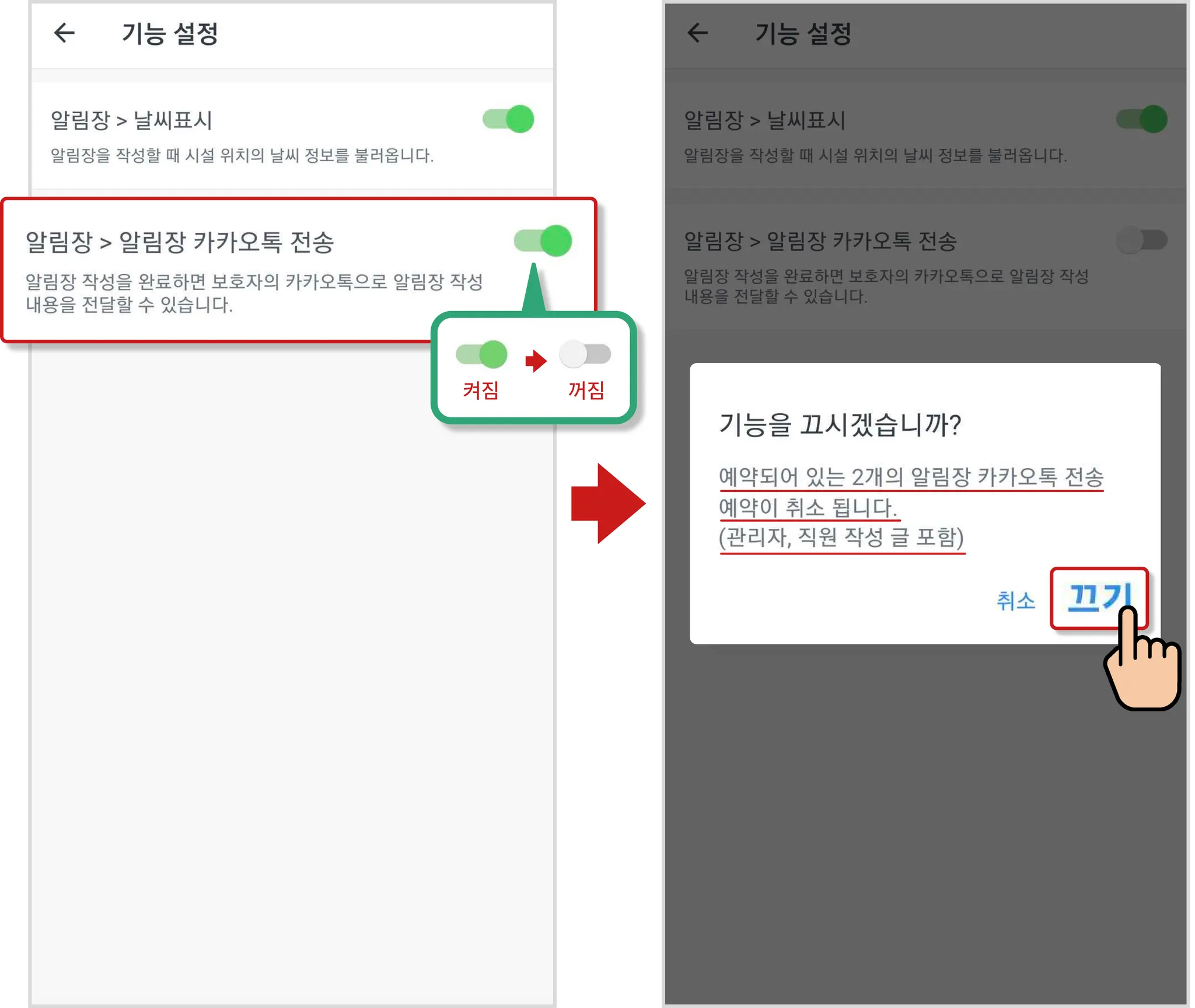 예약전송 알림장이 있는 상태에서 알림톡 기능을 끌 경우,
