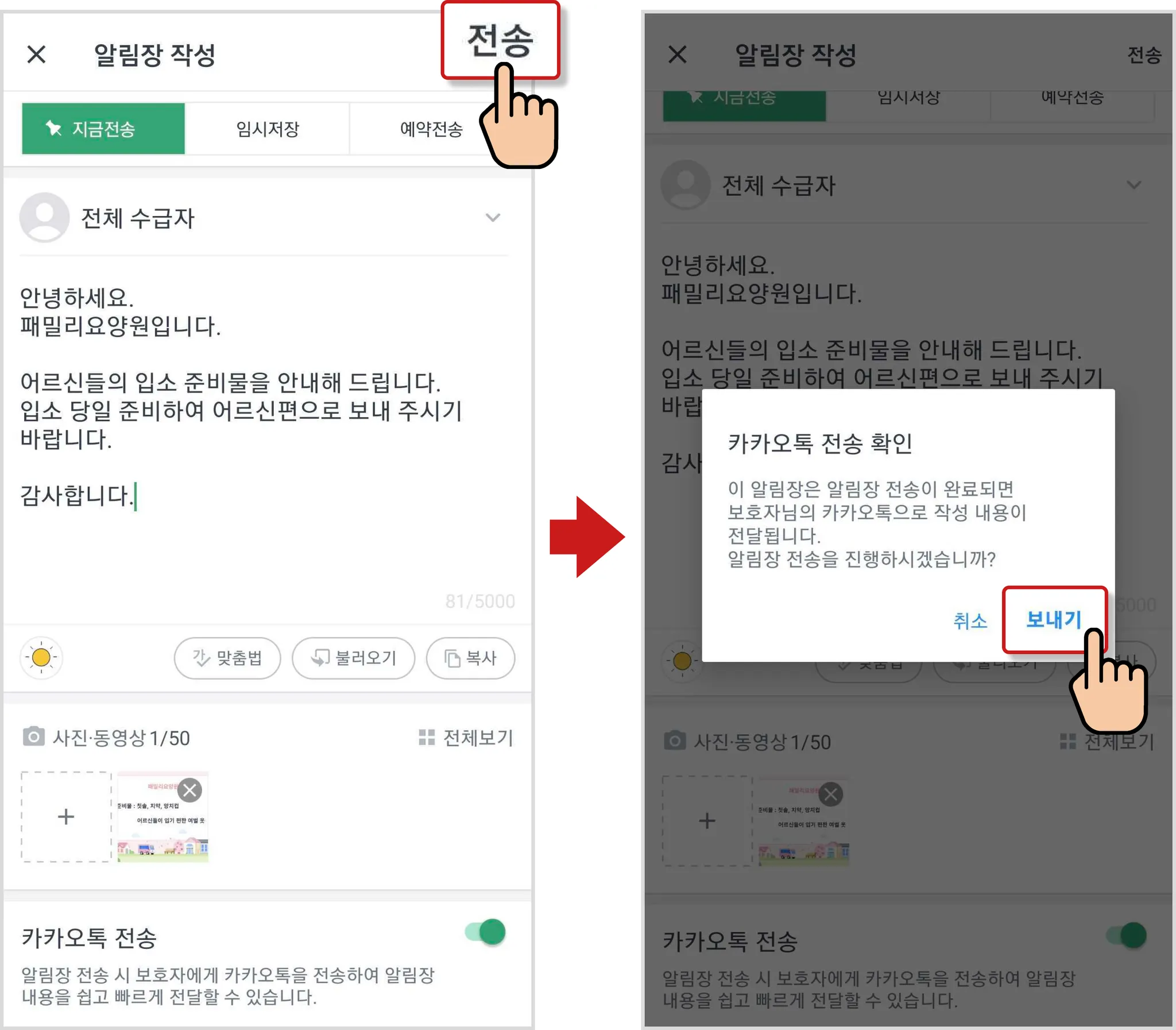 알림장 카카오톡 전송 방법