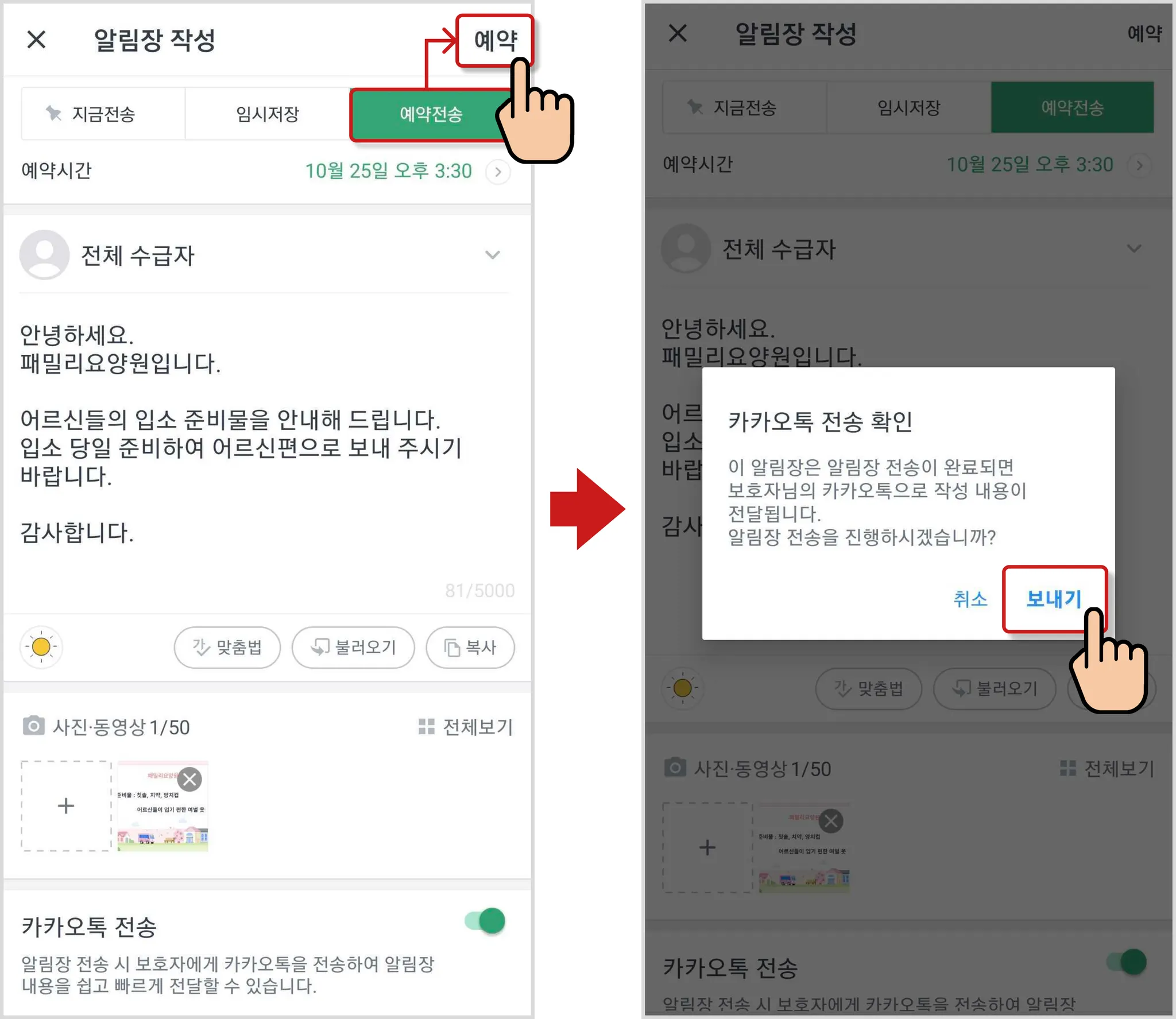 알림장 작성 후, 카카오톡 전송 버튼이 켜있는 상태에서 예약전송을 선택하고, 우측 상단의 예약 버튼을 누릅니다.