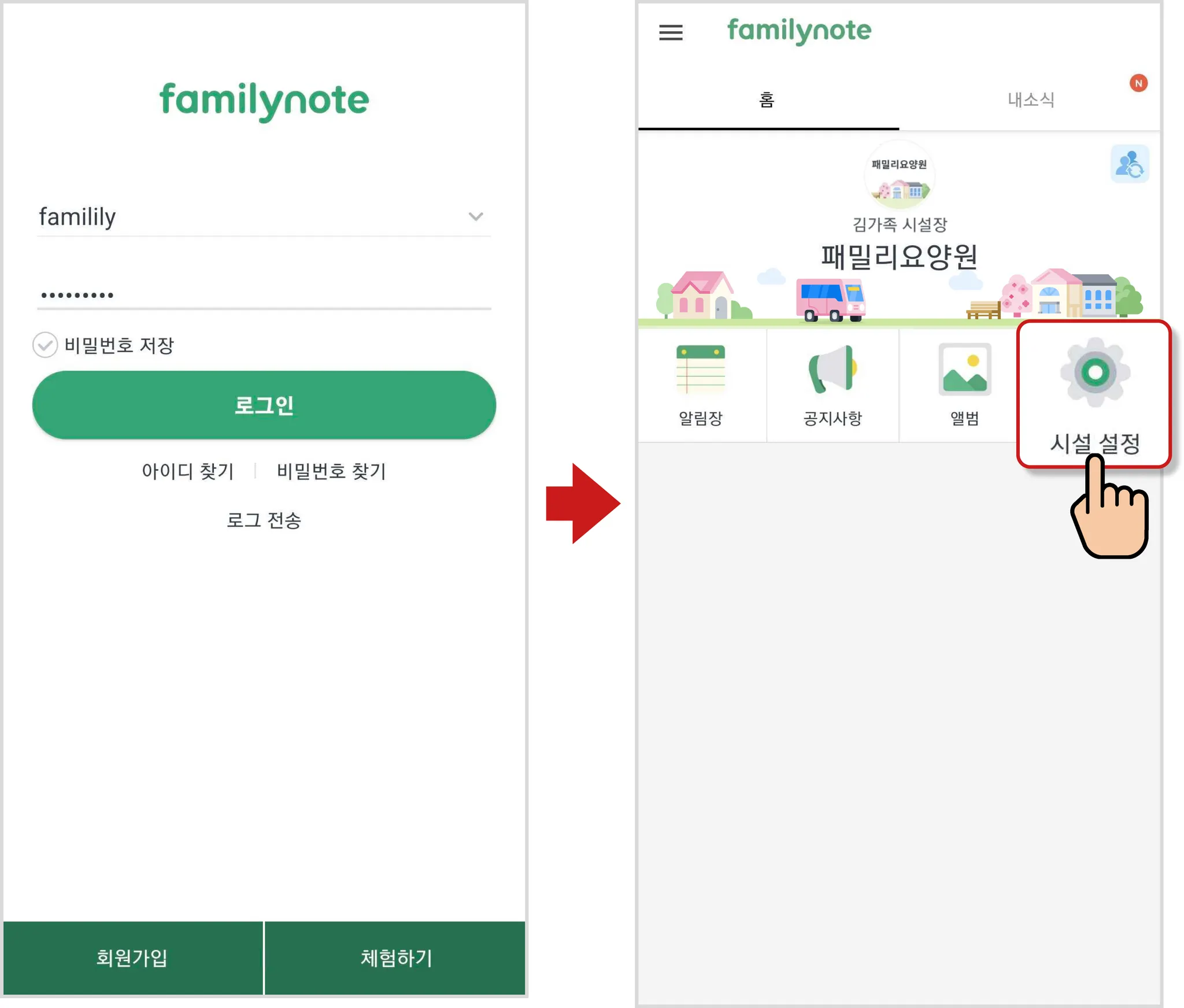 패밀리노트 앱을 켜고 로그인을 한 후, 메뉴의 [시설 설정]을 누릅니다.