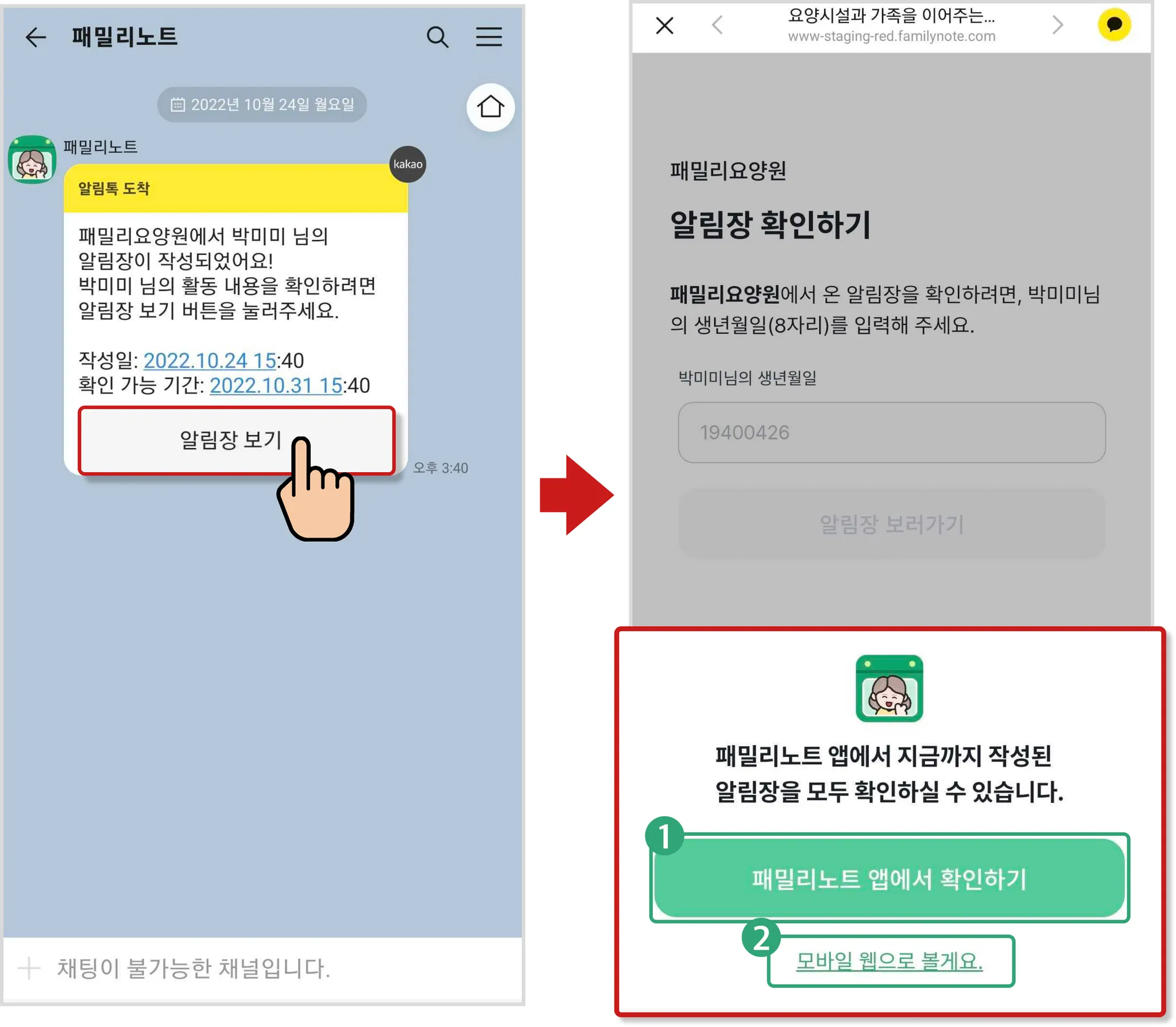 [알림장 보기]를 누르면 [패밀리노트 앱에서 확인하기]와 [모바일 웹으로 볼게요]가 적힌 팝업이 나타납니다.