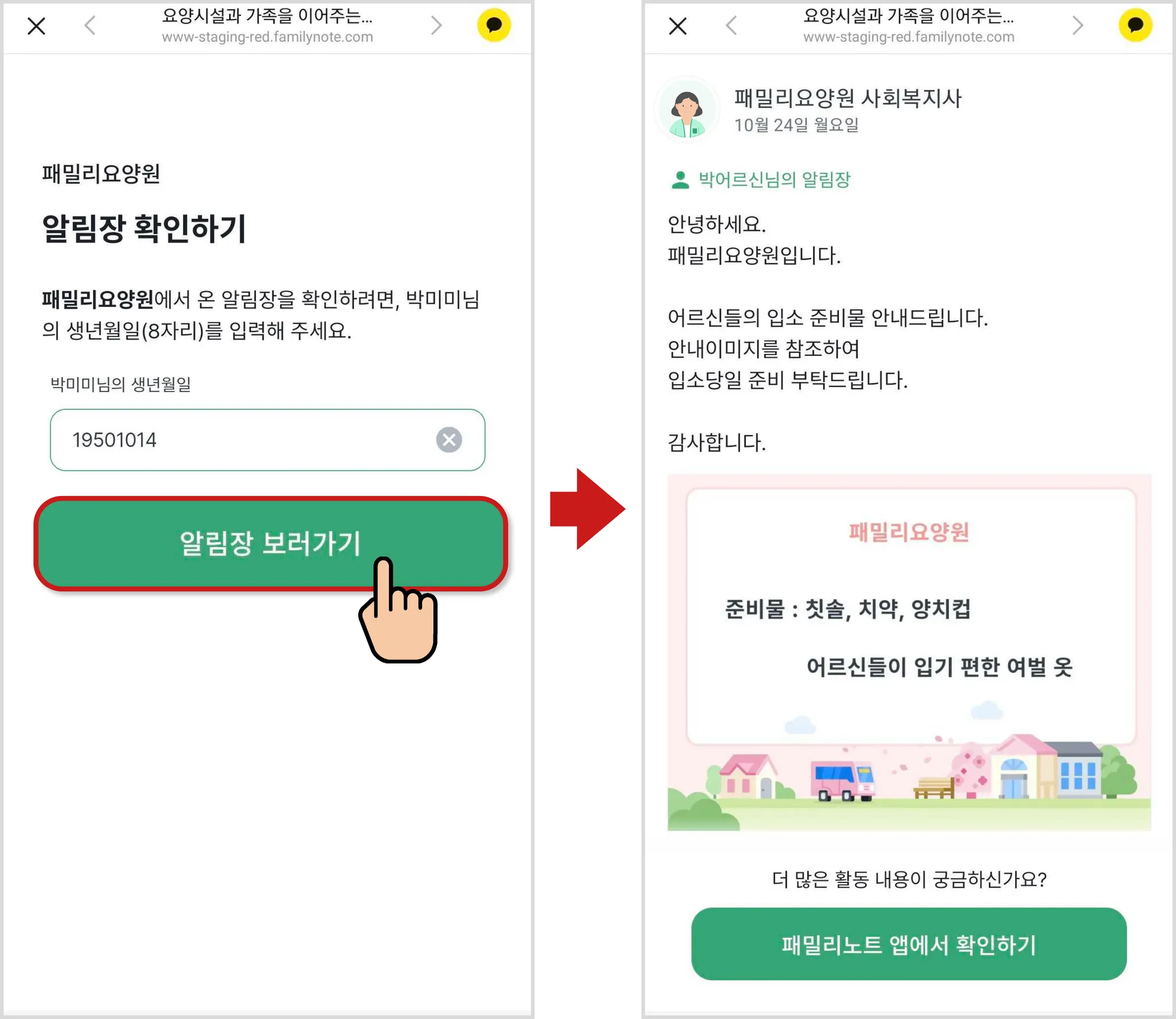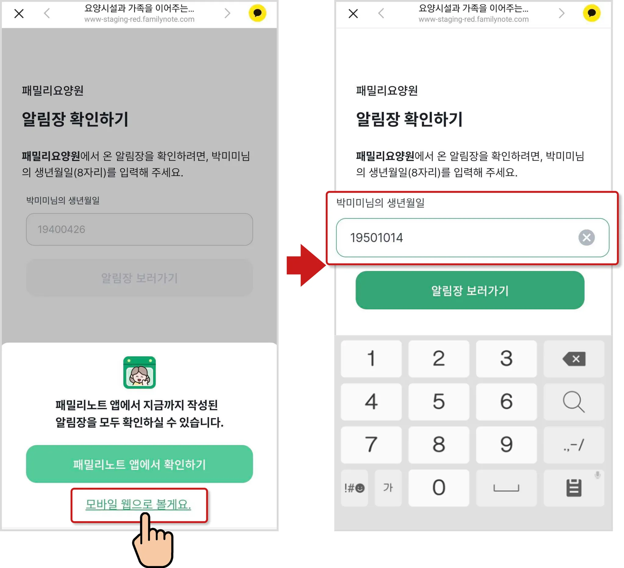 [모바일 웹으로 볼게요]를 누르면, 알림장 확인을 위해 어르신의 패밀리노트 가입시 기입한 생년월일 8자리를 입력합니다.