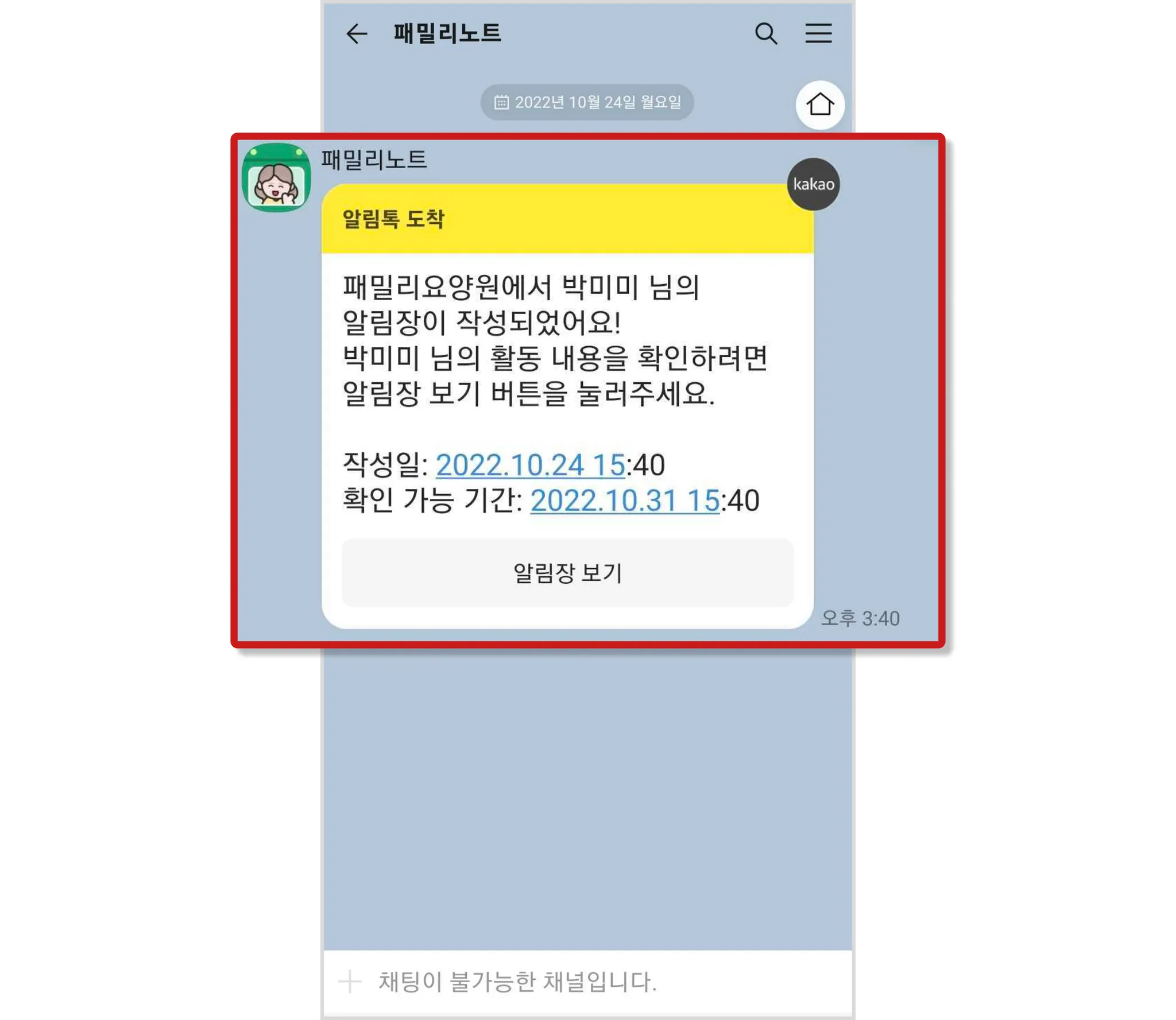 시설에서 알림장 카카오톡 전송 기능 설정 후, 알림장을 보내면 카카오톡 메시지로 패밀리노트 알림톡이 도착합니다.