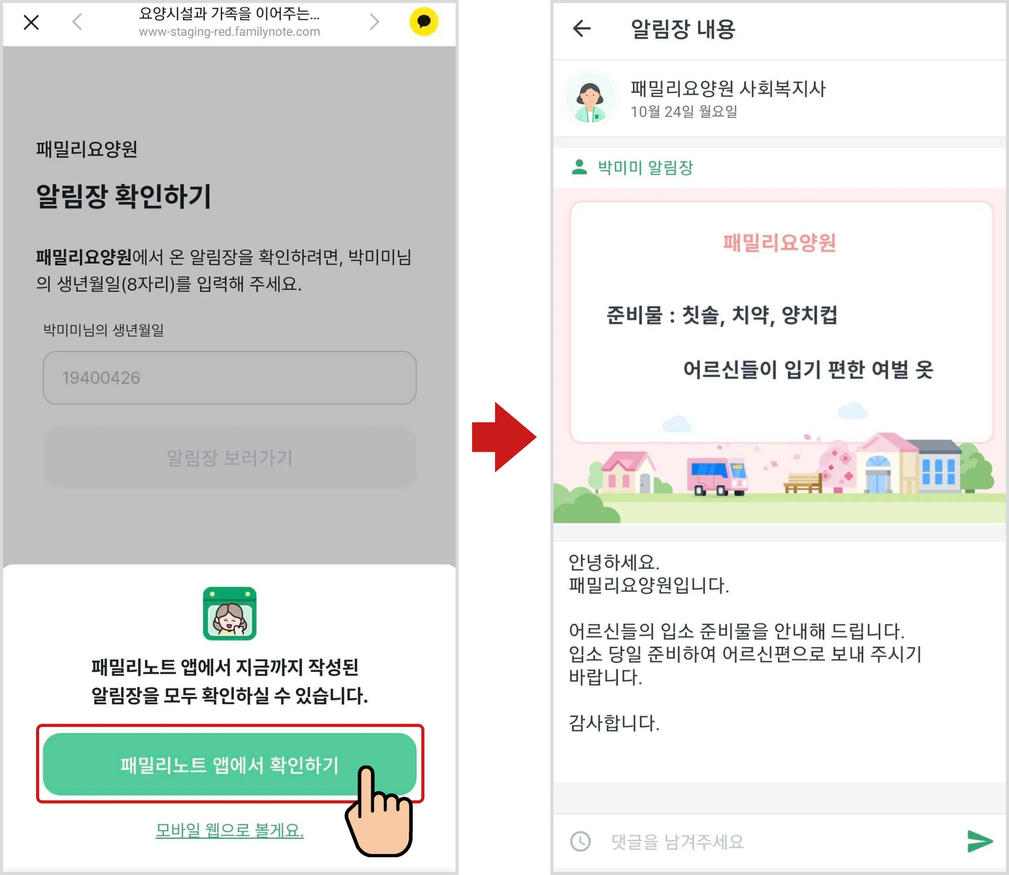 [패밀리노트 앱에서 확인하기]를 누르면, 패밀리 노트 앱으로 이동하여 알림장 확인이 가능합니다.