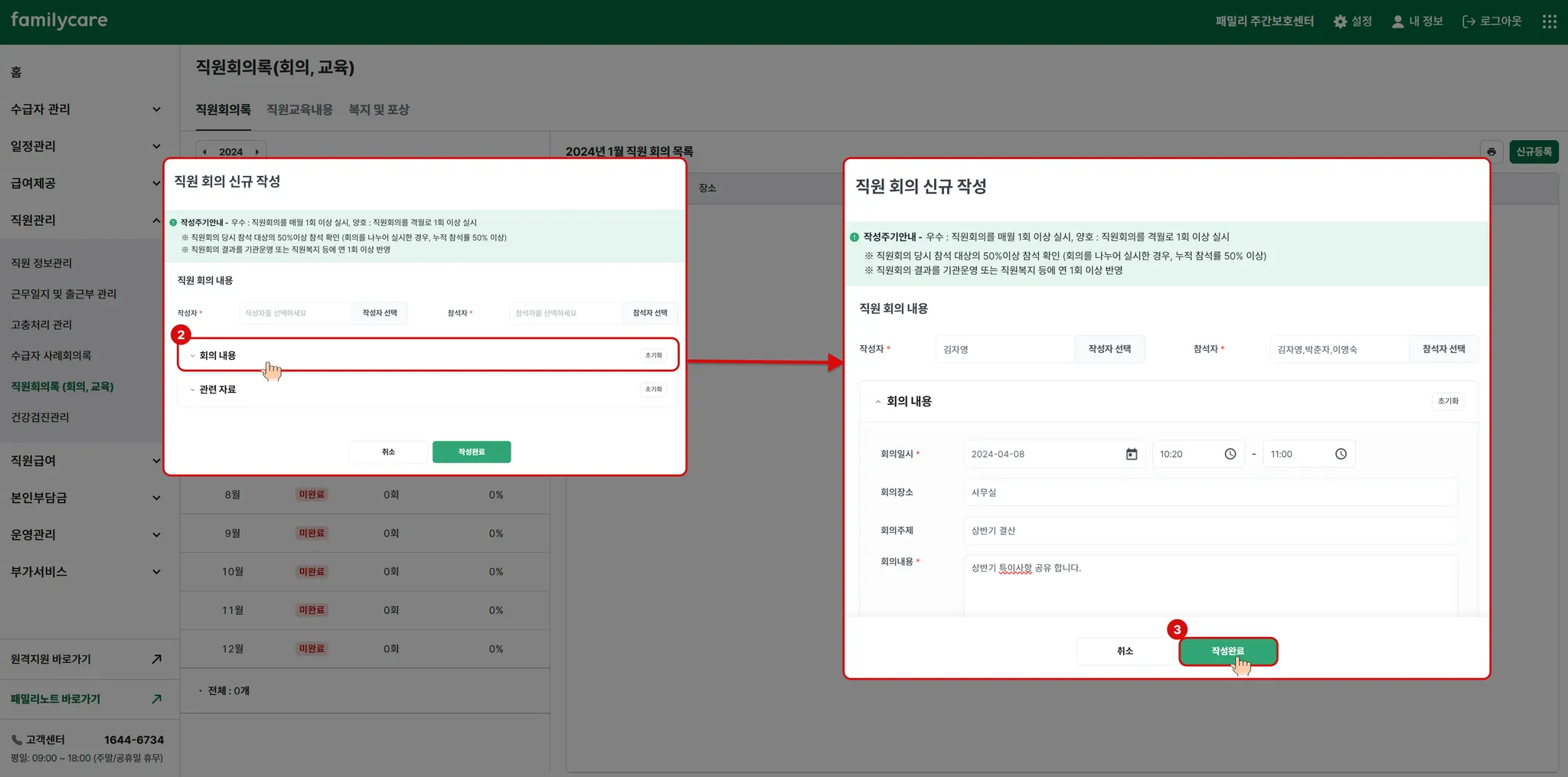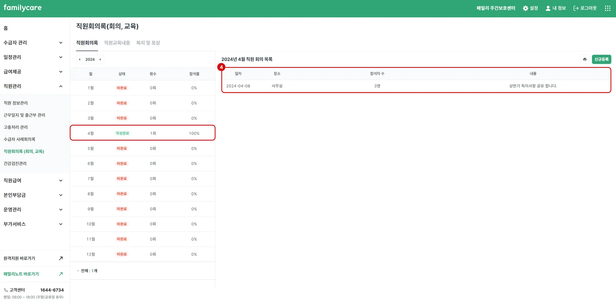 매월 진행해야하는 직원회의록을 작성하고 기록에 남길 수 있습니다. 또한 직원교육내용과 복지 및 포상 내역도 함께 작성할 수 있으니, 직원회의록 기능을 통해 회의 내용을 기록해 보세요