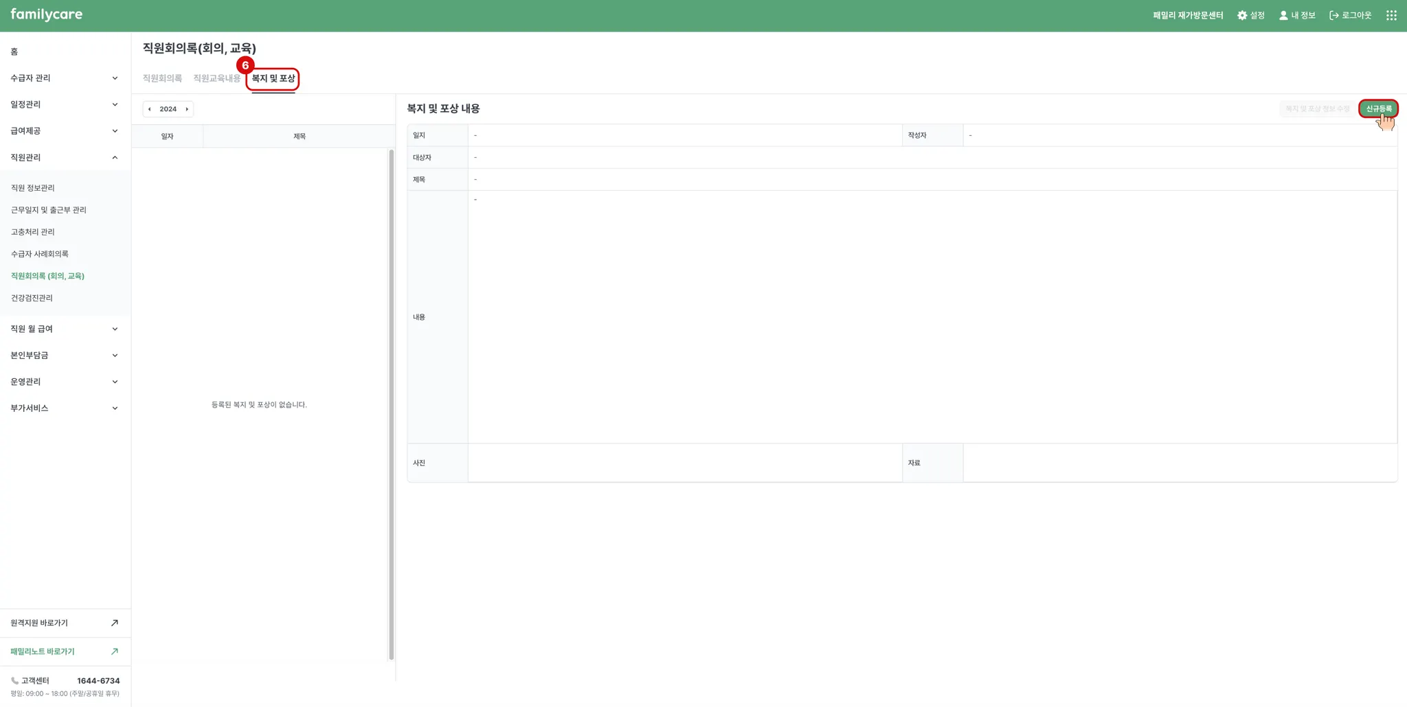 복지 및 포상 탭을 선택하면, 복지 및 포상 내역을 작성할 수 있습니다. 오른쪽 끝에 있는 신규등록 버튼을 통해 복지 및 포상 내역을 등록해 보세요