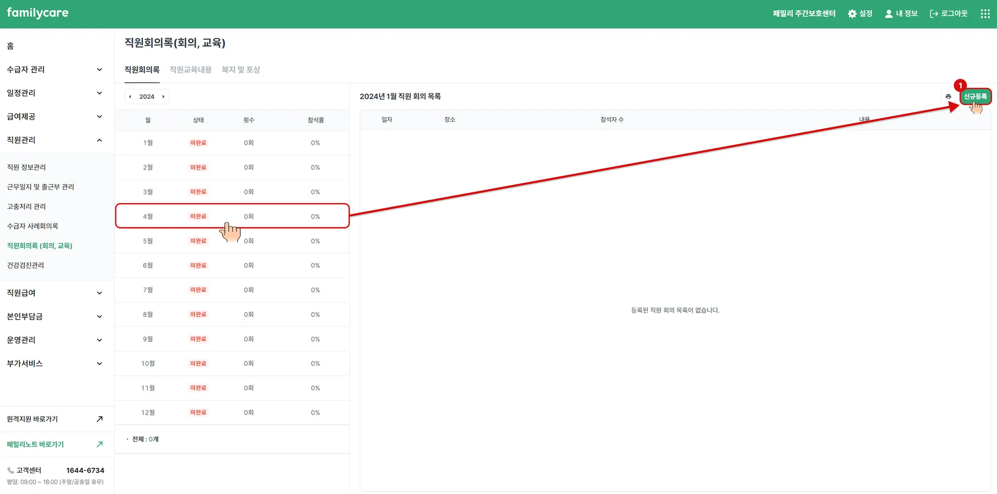 직원회의록을 작성하고자 하는 해당 월을 선택하고, 신규등록 버튼을 클릭합니다.