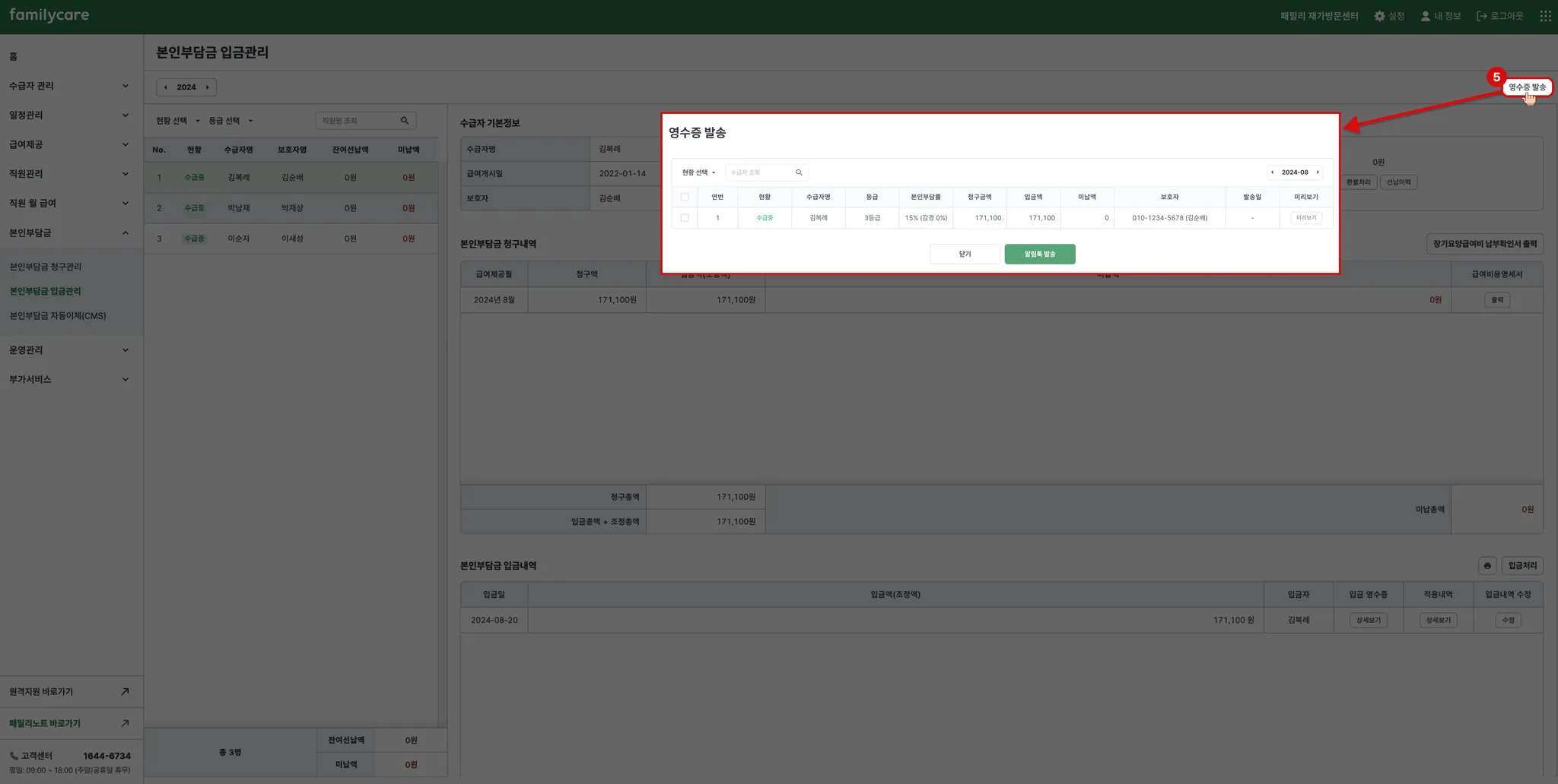 입금된 본인부담금 내역을 관리하고, 본인부담금 명세서를 생성하여 알림톡으로 전송할 수 있습니다.