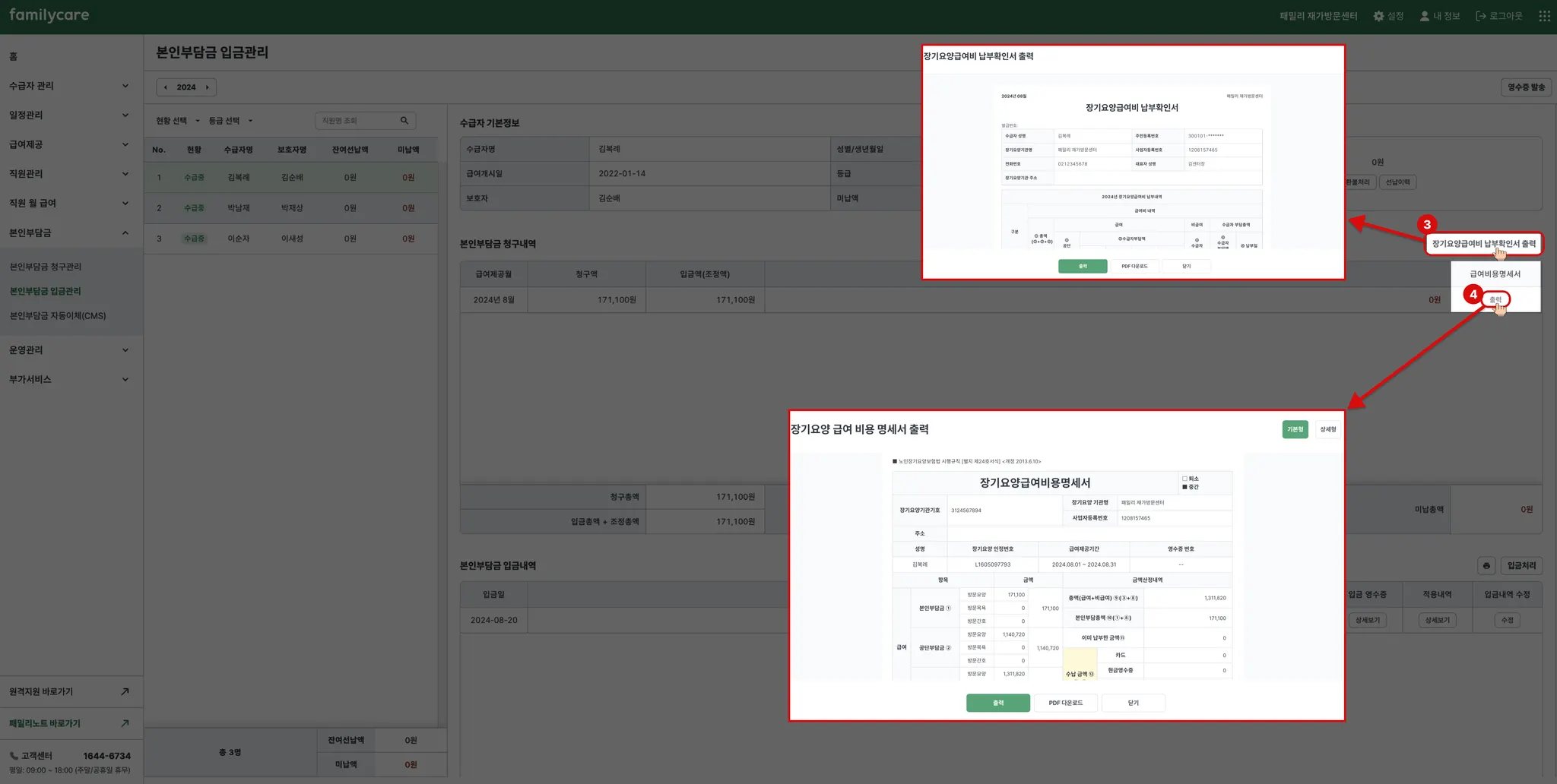 본인부담금 입금 내역을 확인하기 위해 납부확인서를 요청한 경우, 입금내역을 자동으로 불러와 납부확인서를 출력하실 수 있습니다. 입금내역을 저장한 후, 장기요양급여비 납부확인서 출력 버튼을 이용해 주세요!