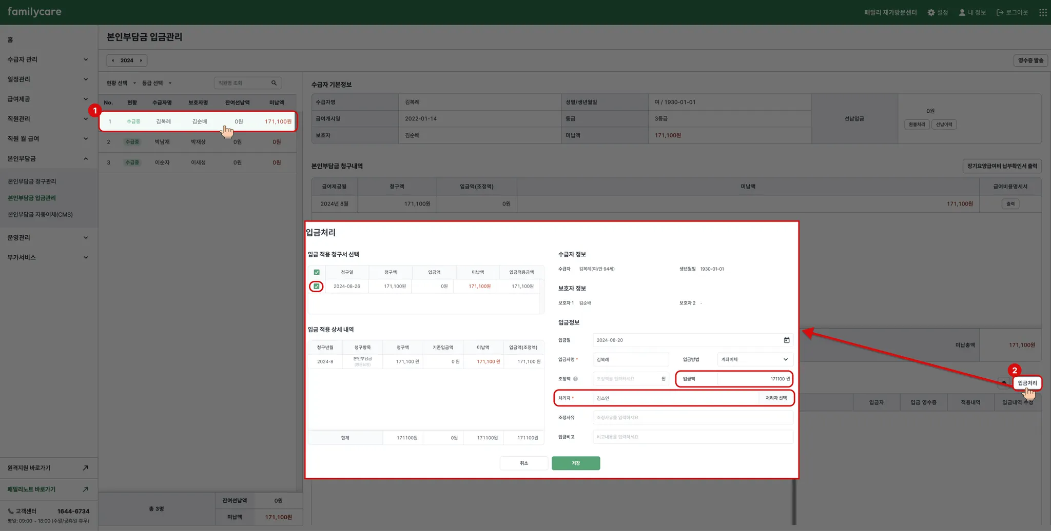 수급자를 선택한 후, 입금처리 버튼을 클릭해주세요. 입금처리 화면에서 입금처리할 청구내용을 확인한 후 체크박스를 눌러주세요.