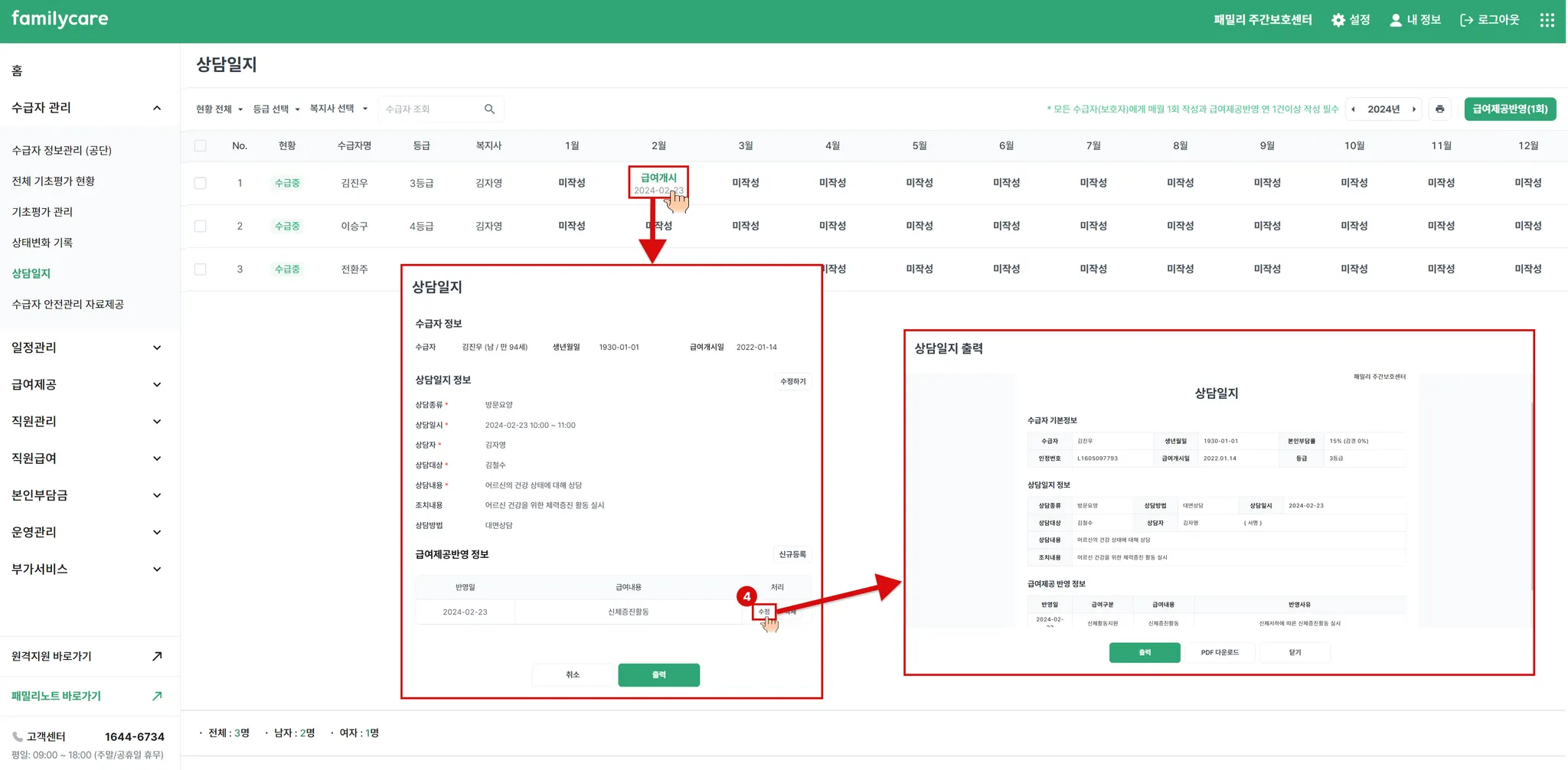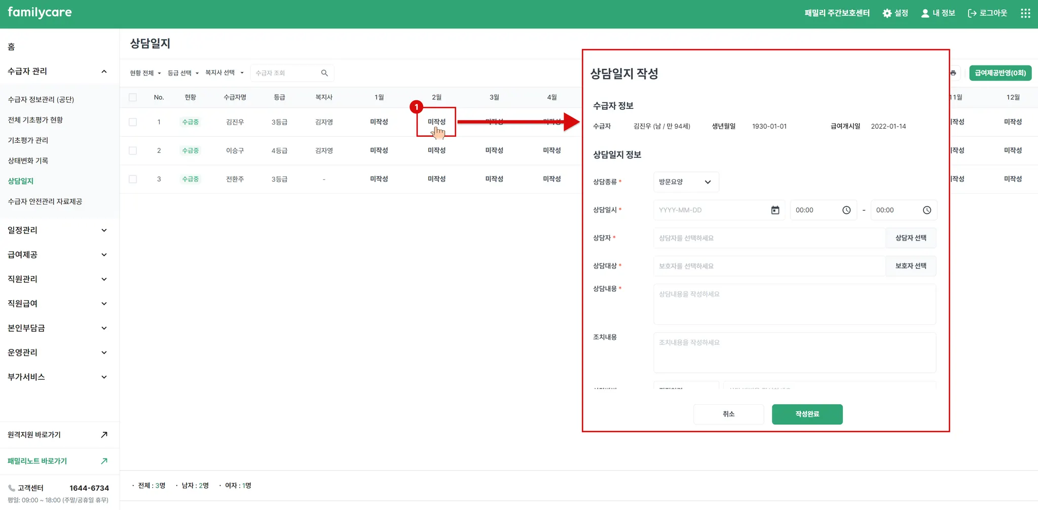 상담일지를 작성하기 위한 수급자와, 해당 월에 있는 미작성 버튼을 클릭 해 주세요. 상담일지를 작성 할 수 있는 창이 나타납니다.