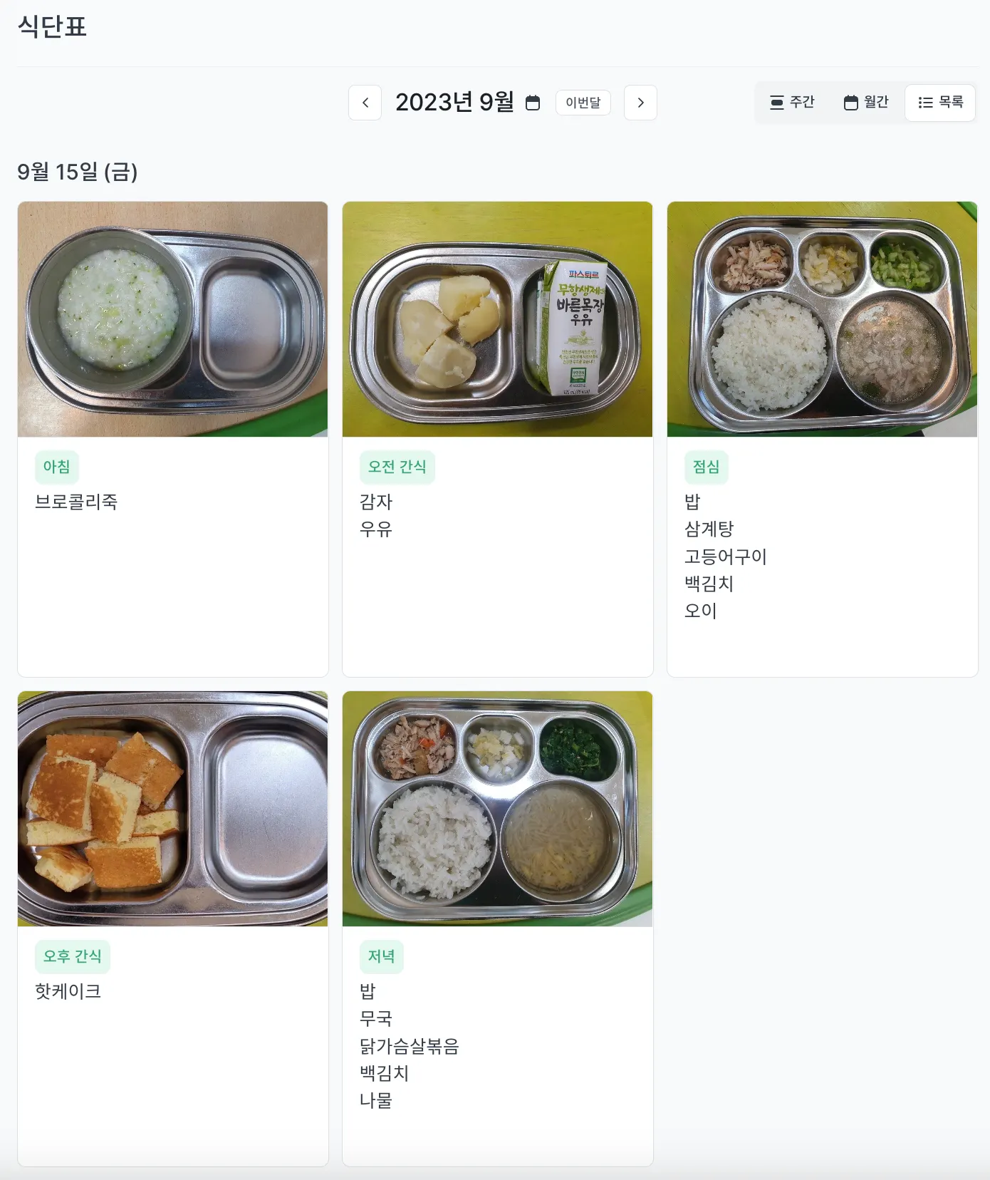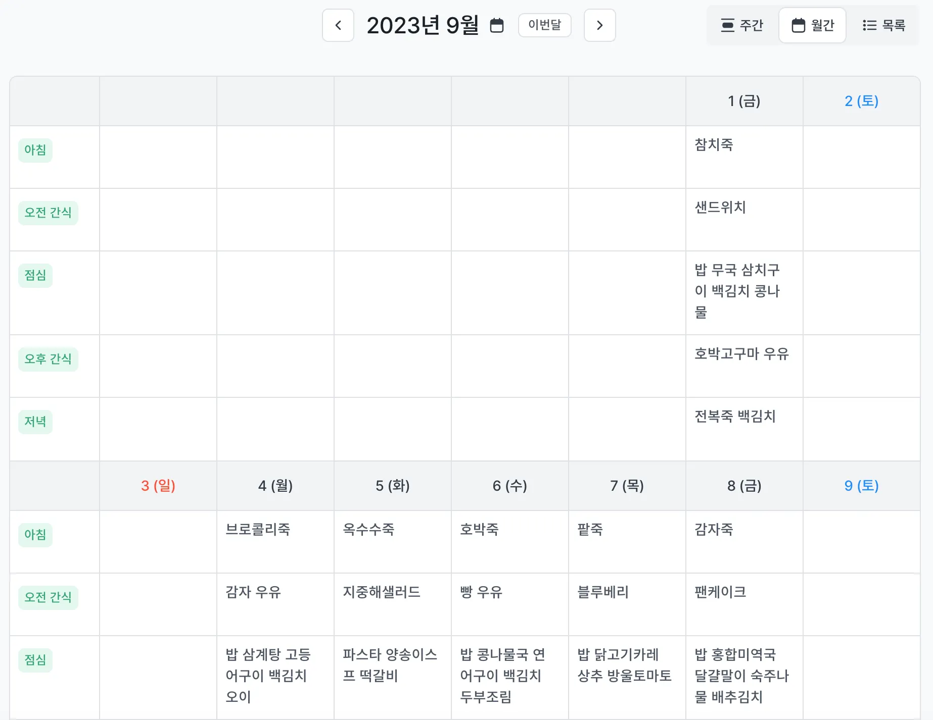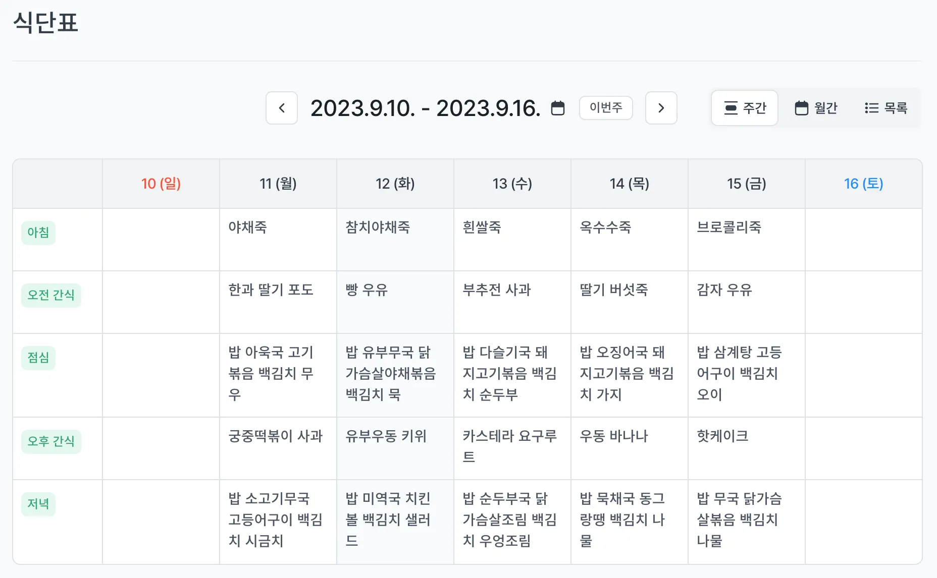 제공된 식단표는 주간/월간/목록 3가지 형태로 볼 수 있습니다.