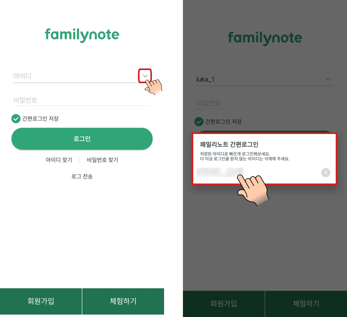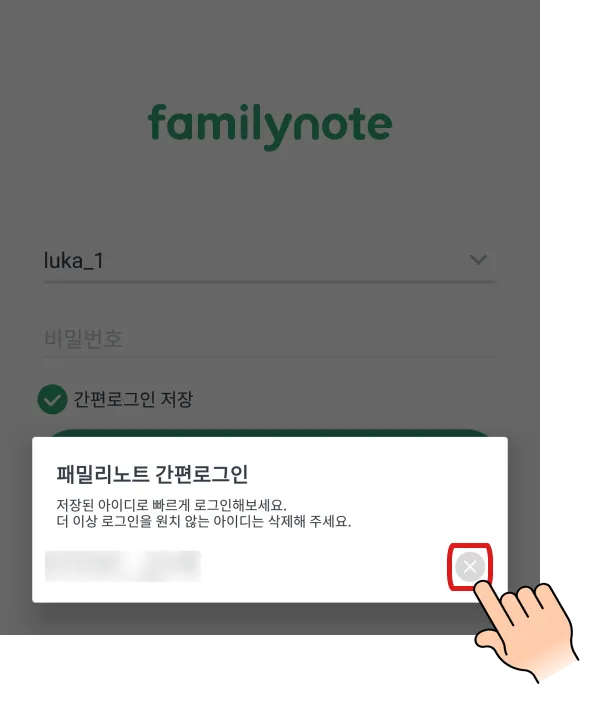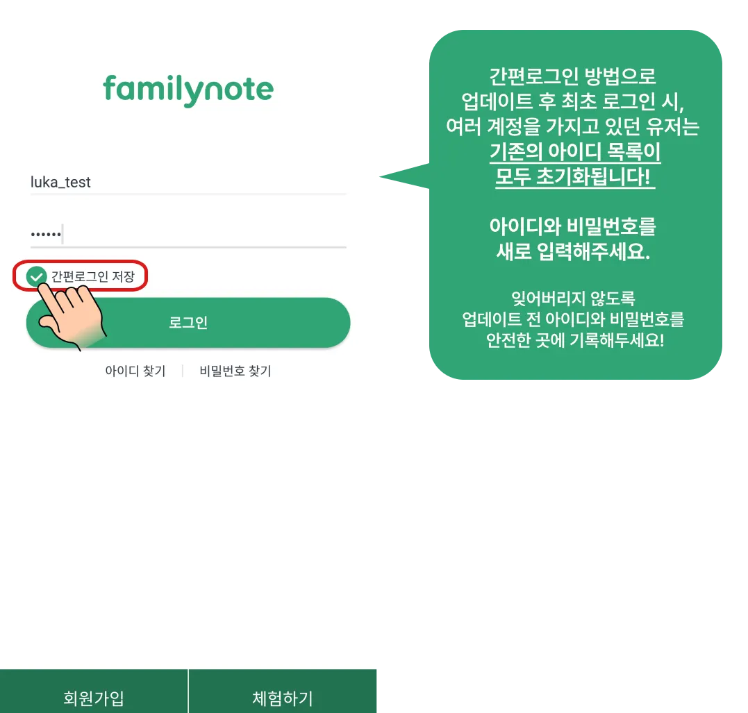 패밀리노트 로그인 화면에서 아이디 비밀번호를 입력 후, 간편로그인 저장이 체크 되어있는지 확인한 뒤 로그인을 눌러주세요!