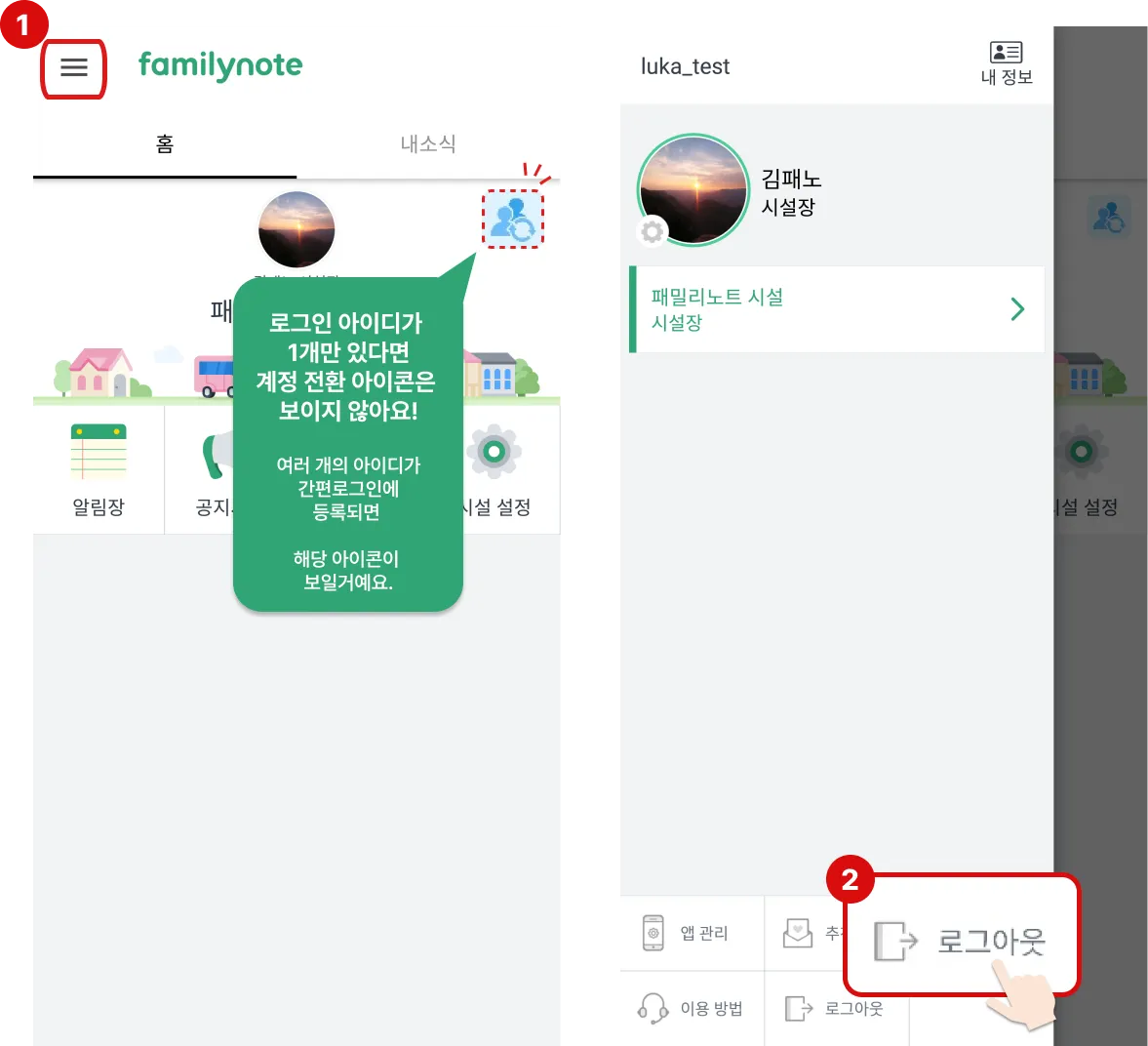 패밀리노트 메인 화면에서 계정 전환 아이콘이 사라졌어요!