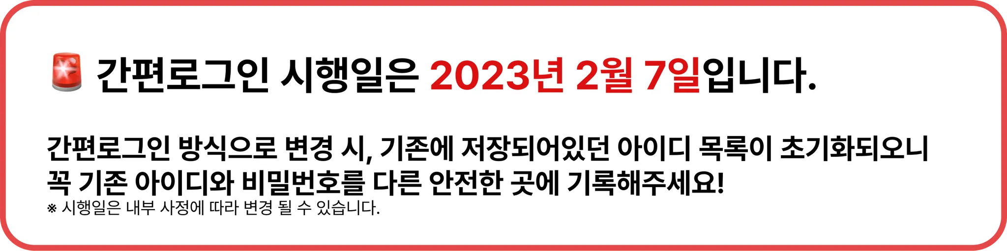 비밀번호가 변경되었거나, 해당 아이디를 탈퇴한 경우! 간편로그인에서 아이디 선택 시 로그인이 되지 않으니 꼭 기억해주세요!
