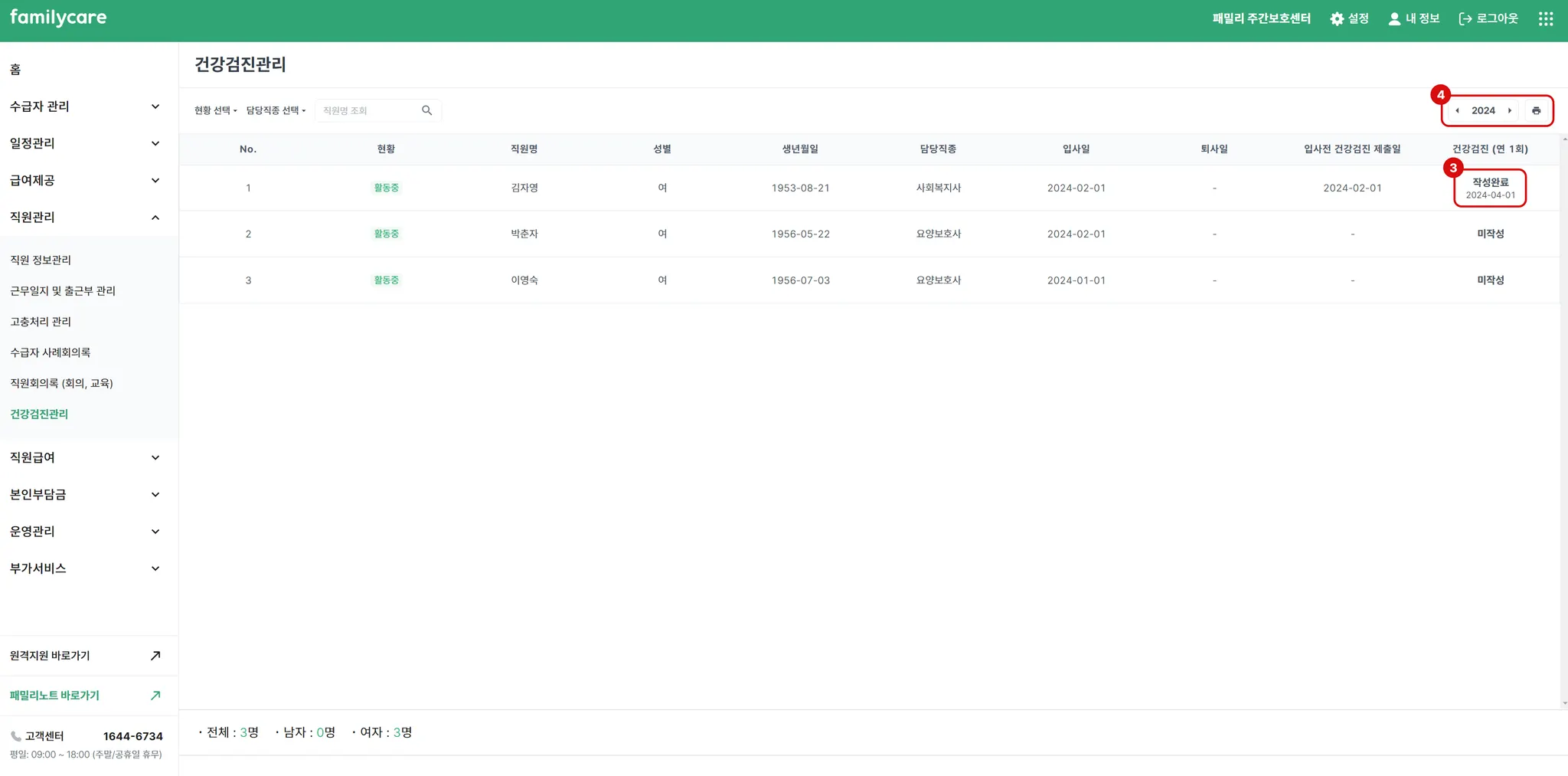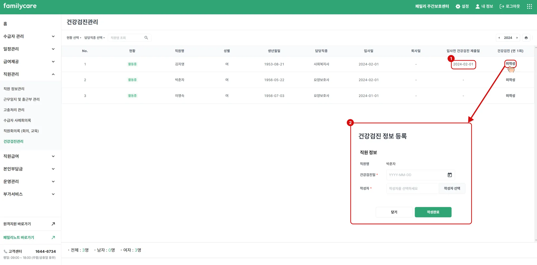 미작성 버튼을 눌러 해당연도의 건강검진 정보등록을 할 수 있습니다. 건강검진일과 해당 내용을 확인하고 작성한 작성직원을 선택하고 작성완료 버튼을 클릭해 주세요