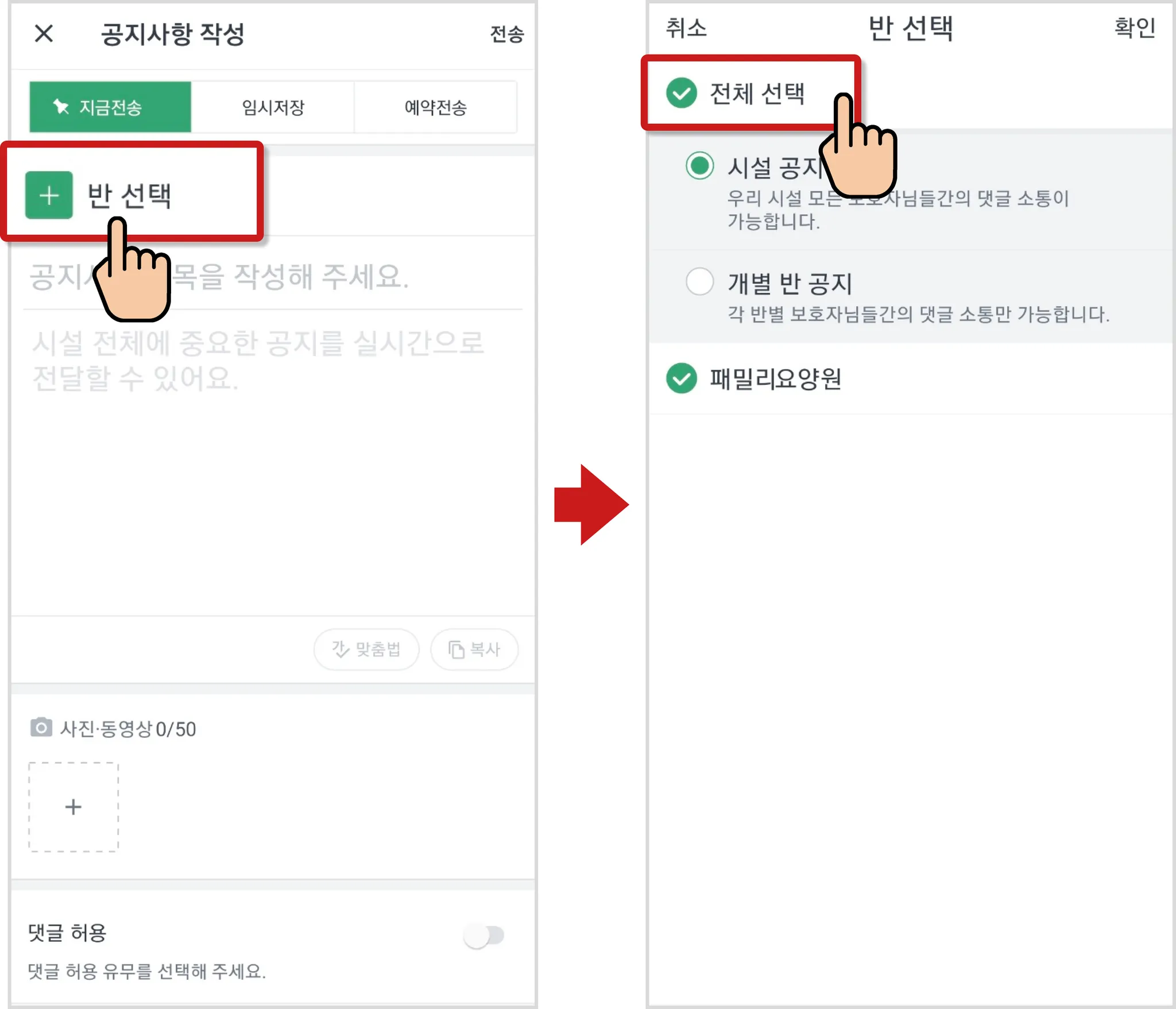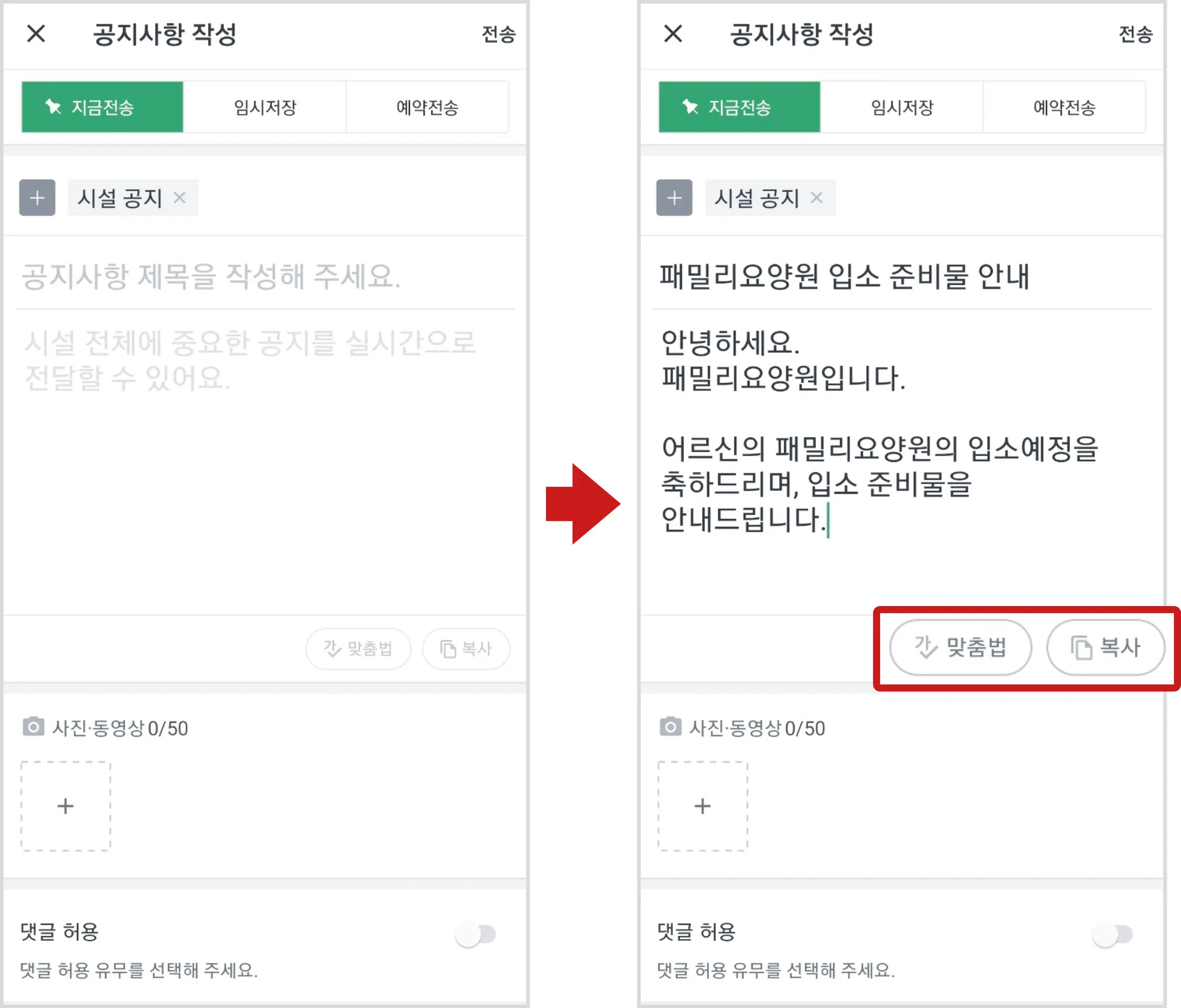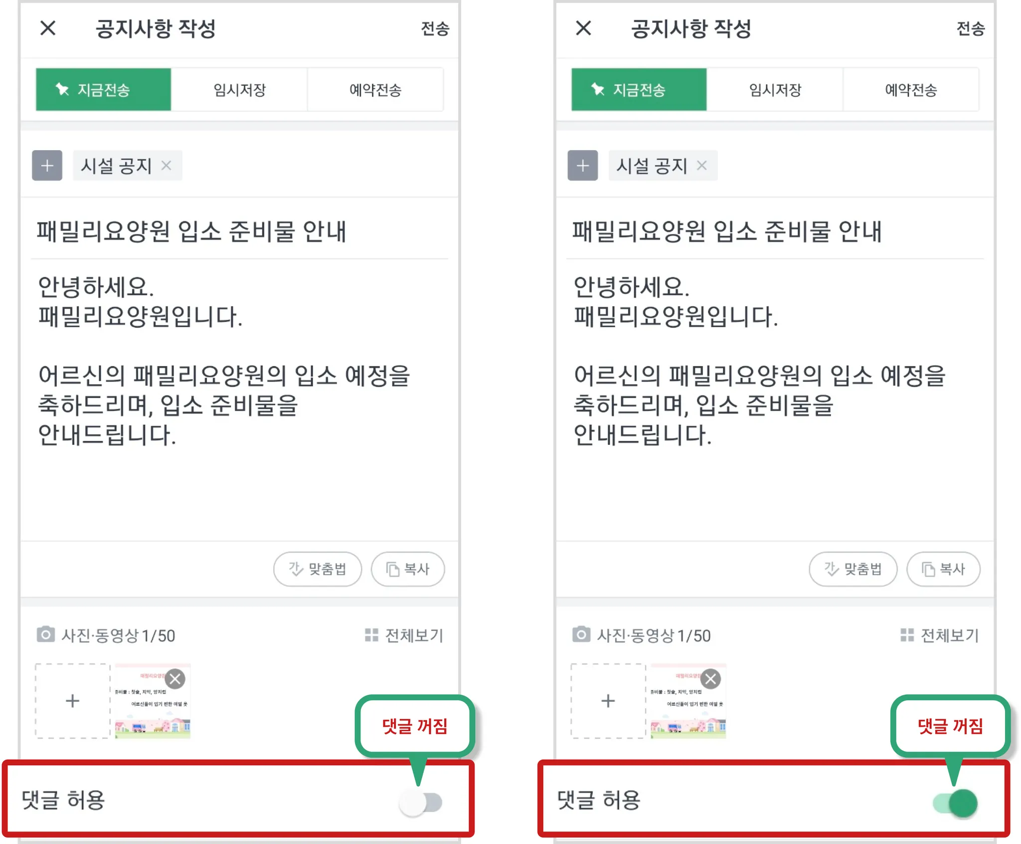 [댓글 허용] 선택에 따라 해당 공지사항을 받은 보호자와 댓글 소통 여부를 선택할 수 있습니다.