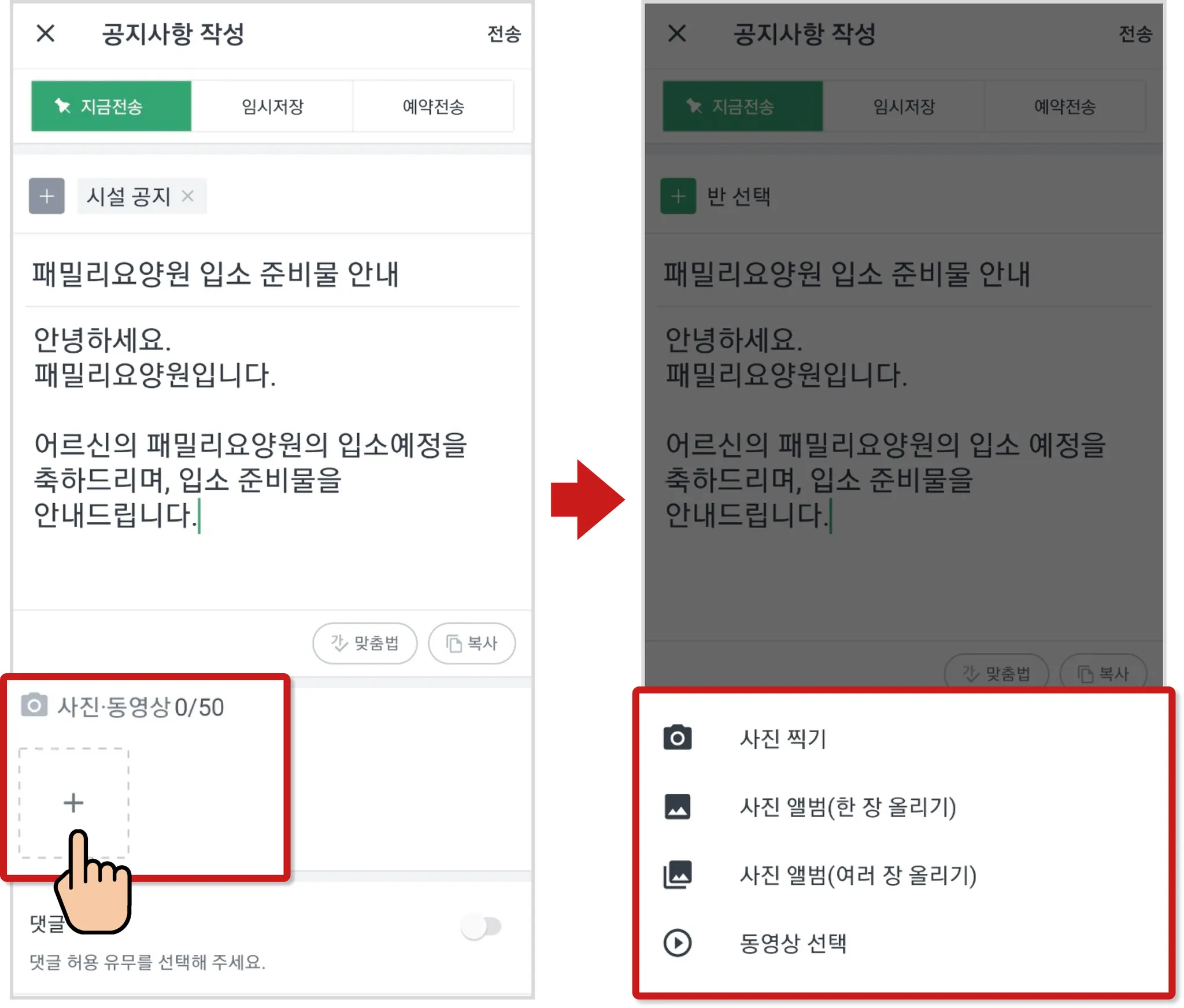 지금전송 : 즉시 보호자님께 공지사항이 발송됩니다.
