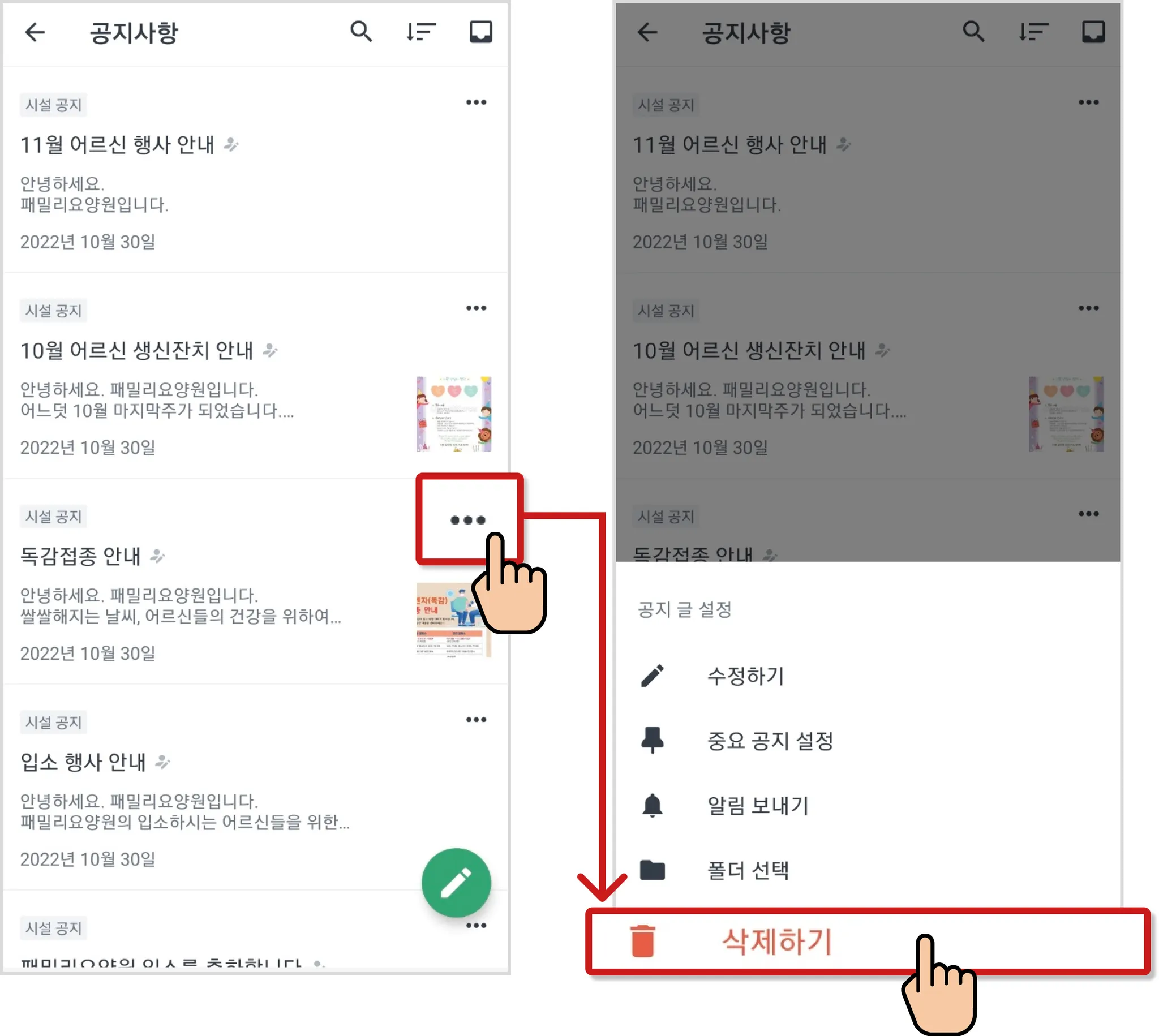 시설 공지, 개별 반 공지 모두 동일합니다.