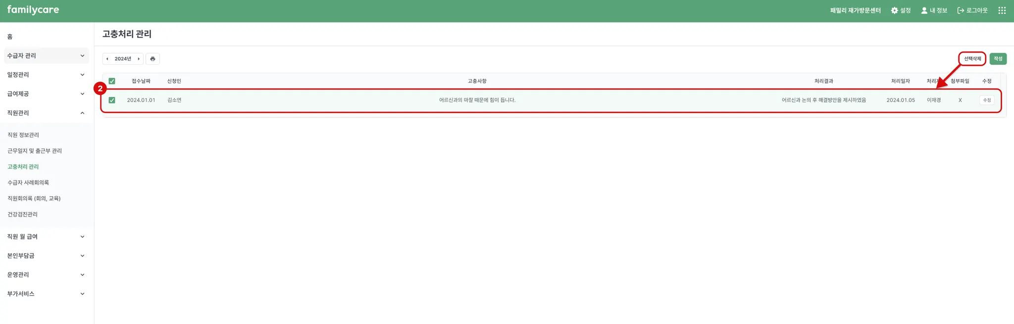 2) 고충처리 입력 내용 확인하기 / 삭제하기