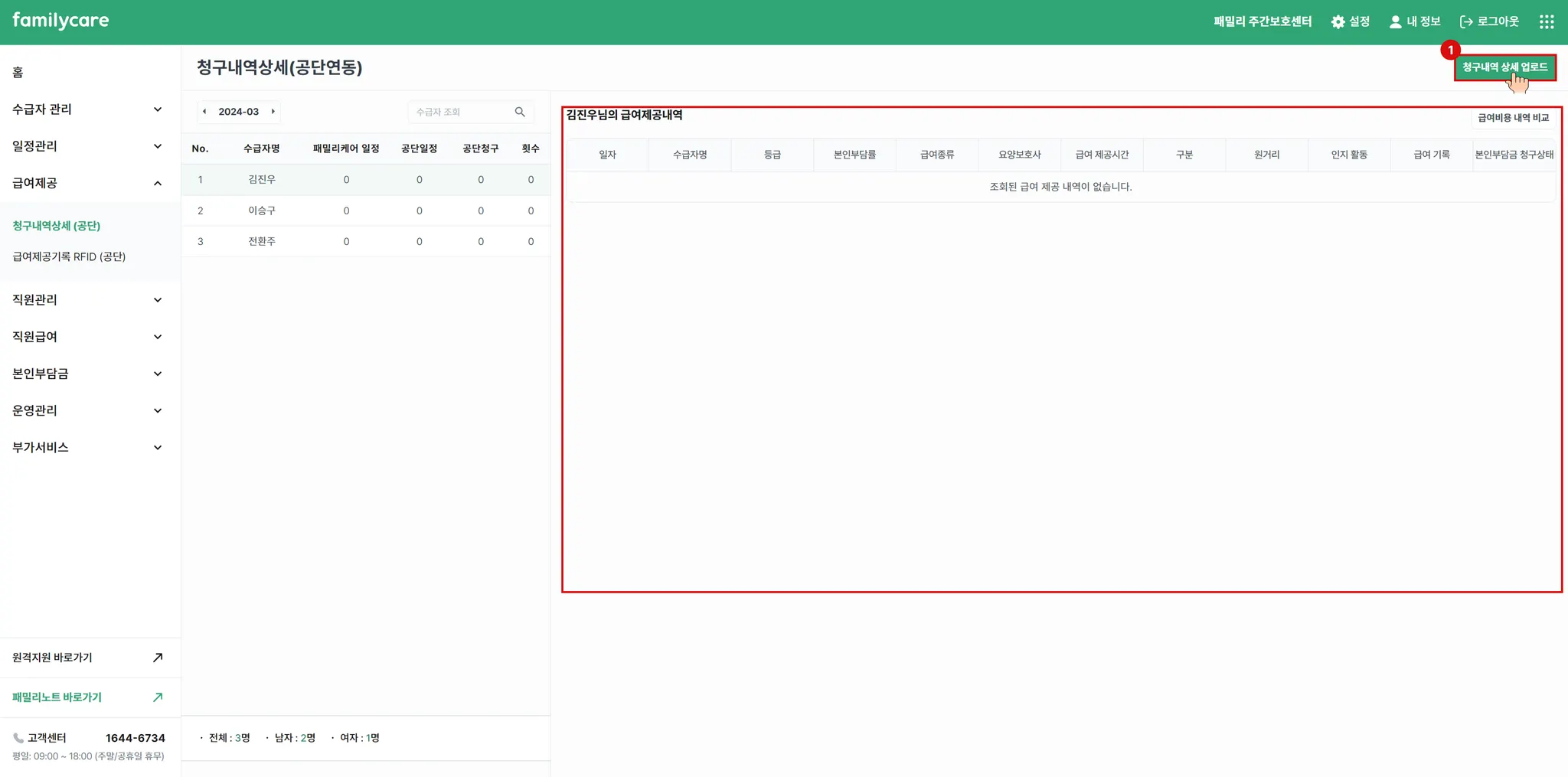 청구내역상세는 공단 롱텀케어에서 청구한 금액을 토대로 급여제공 내역을 업로드 하는 메뉴 입니다.