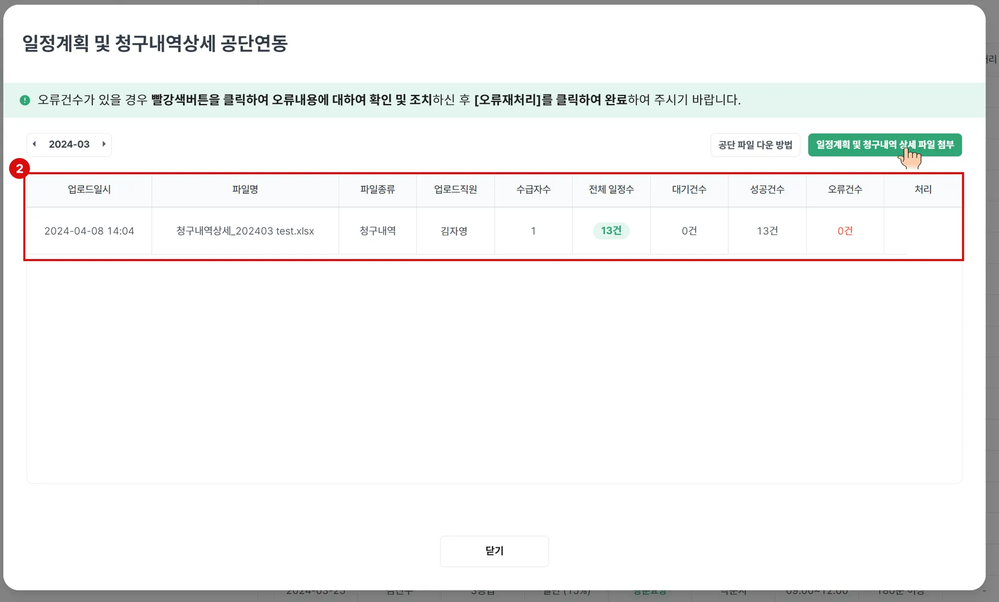 공단에서 다운로드한 청구내역상세 엑셀 파일을 업로드면, 해당 화면처럼 성공한 일정건수를 확인할 수 있습니다. 혹시 오류건수가 있거나, 대기건수가 있는 경우 해당월이 맞는지, 수급자와 직원의 등록이 잘 되어 있는지 확인해 주세요
