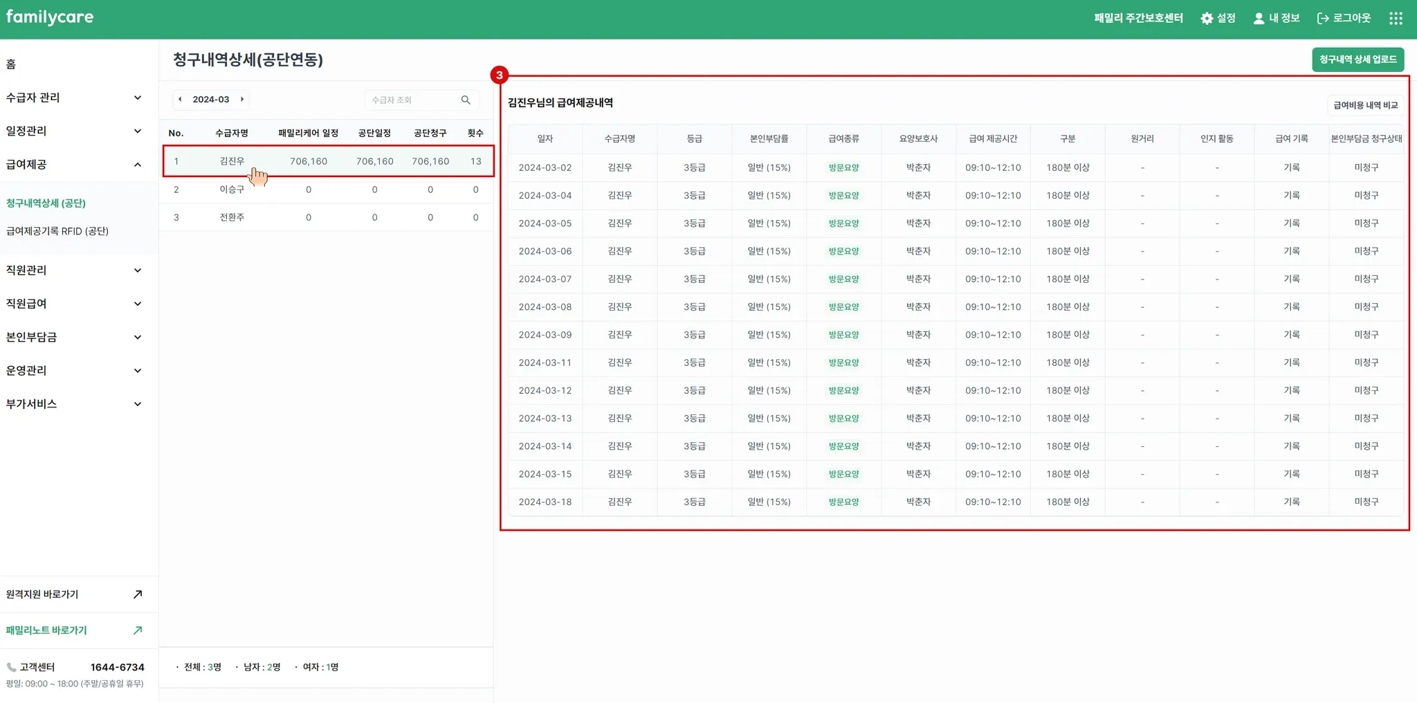 청구내역상세를 업로드 하고 나면, 실제 근무한 내역을 확인할 수 있습니다. 수급자별 공단청구 내역과 횟수가 맞는지 확인 후, 내역이 맞다면 업로드 한 내용을 토대로 급여제공기록 RFID 태그 내역을 비교하게 됩니다.