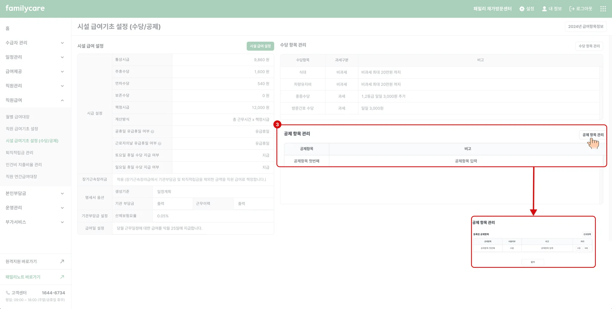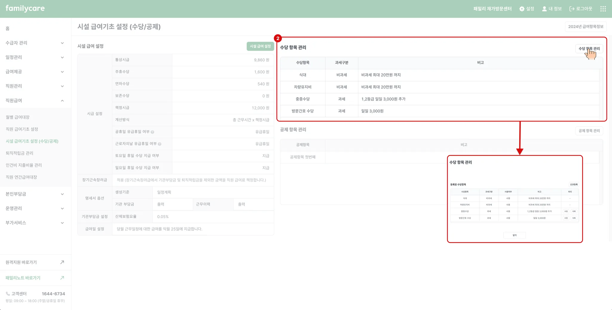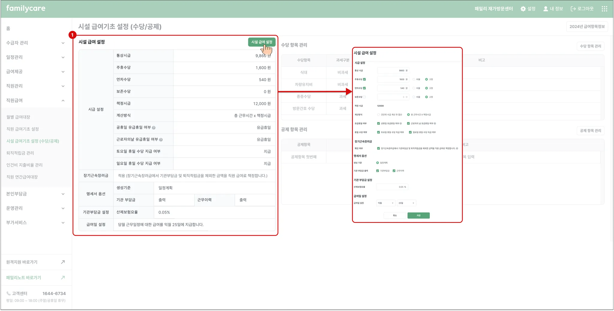 시설에서 제공하는 시급부터 수당까지 제공방식을 결정하는 메뉴 입니다. 해당 정보를 토대로 급여명세서가 계산되니 시설에서 결정한 금액을 정확하게 입력해 주세요