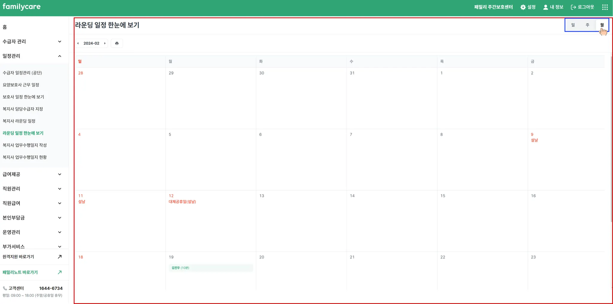 월별로 사회복지사의 업무수행일정을 확인 할 수 있습니다. 수급자의 이름과 방문시간만 노출됩니다.