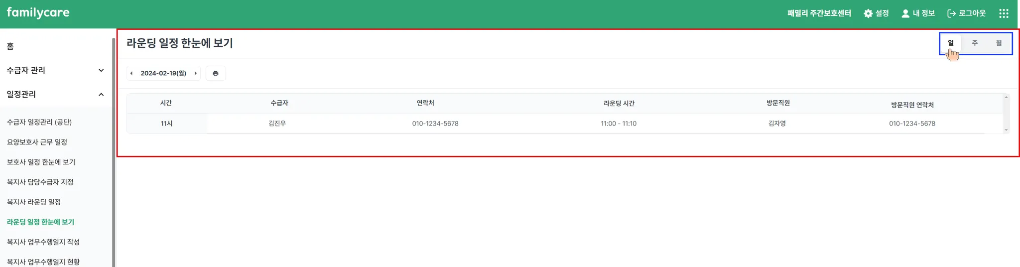 일별로 사회복지사의 업무수행일정을 확인 할 수 있습니다. 수급자, 수급자 연락처, 라운딩 시간,사회복지사, 사회복지사 연락처 등 이 곳에서는 좀 더 상세하게 정보를 확인 할 수 있습니다.